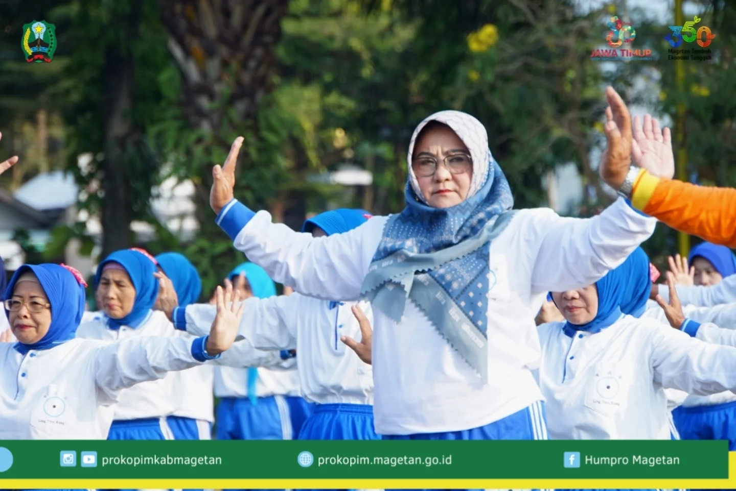 Bupati Magetan, Hj. Nanik Endang Rusminiarti, M.Pd turut hadir dalam peringatan ini dan terlihat antusias mengikuti gerakan senam bersama para peserta.