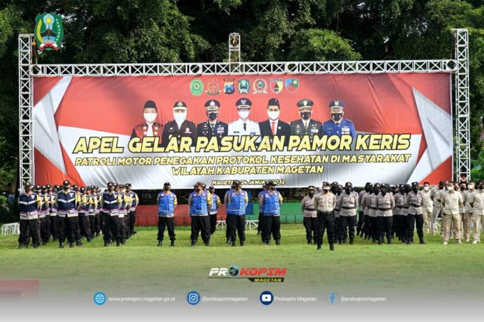 Menyikapi akan rendahnya kesadaran masyarakat dalam menerapkan protokol kesehatan dan demi menekan angka penyebaran COVID-19, terlebih sejak ditemukannya suspek penderita varian baru Omicorn, pagi ini, Senin (24/01/2022) bertempat di Alun-alun Magetan telah dilaksanakan Apel Kesiapan Pasukan Pamor Keris (Patroli Bermotor Penegakan Protokol Kesehatan di Masyarakat) wilayah Kabupaten Magetan.