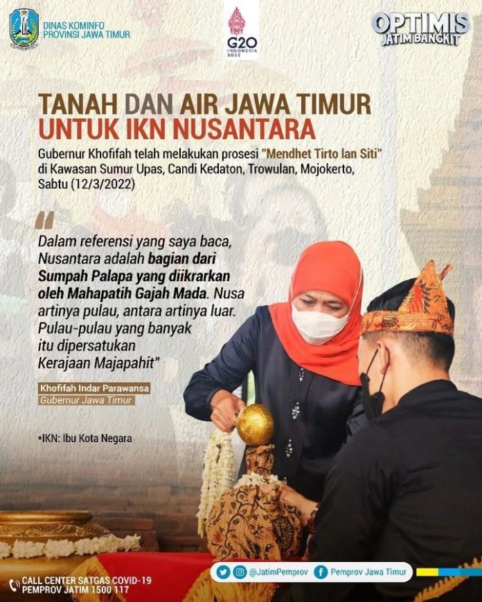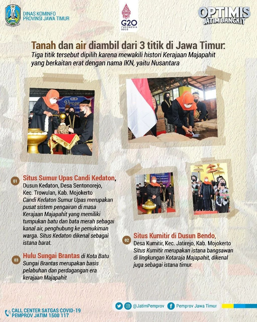 Mengenai air dan tanah dari Provinsi Jawa Timur, Gubenur Khofifah pada Sabtu (12/3) telah melakukan prosesi “Mendhet Tirto lan Siti” sebelum berangkat ke Kabupaten Penajam Paser utara, Kalimantan Timur. Pengambilan air dan tanah diambil dari tiga titik lokasi yang berbeda, yaitu Situs Sumur Upas Candi Kedaton, Situs Kumitir dan Hulu Sungai Brantas.