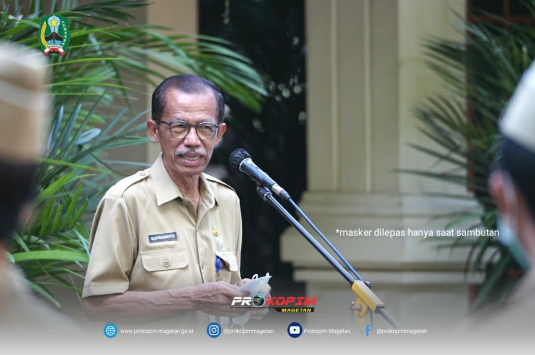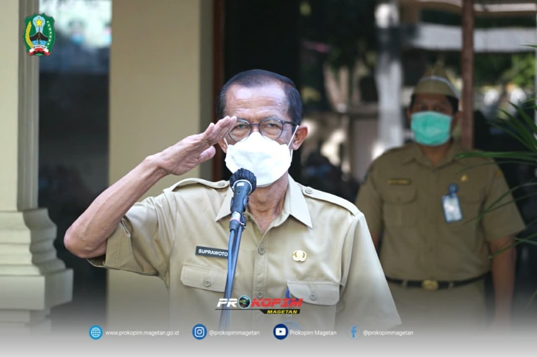 Bupati Magetan Suprawoto menyampaikan permohonan maaf dan sekaligus terimakasih kepada seluruh peserta apel, karena 1 (satu) tahun 10 (sepuluh) bulan ini kita terbelenggu oleh pandemi yang sangat luar biasa dampaknya. Tentu saja menggangu kehidupan masyarakat sekaligus mengganggu pelayanan terhadap masyarakat dan cara kita bekerja. Namun jika kita bersama sama, bahu-membahu, bergotong-royong pasti akan bisa kita lewati dengan selamat dan kondisi jauh lebih baik lagi.