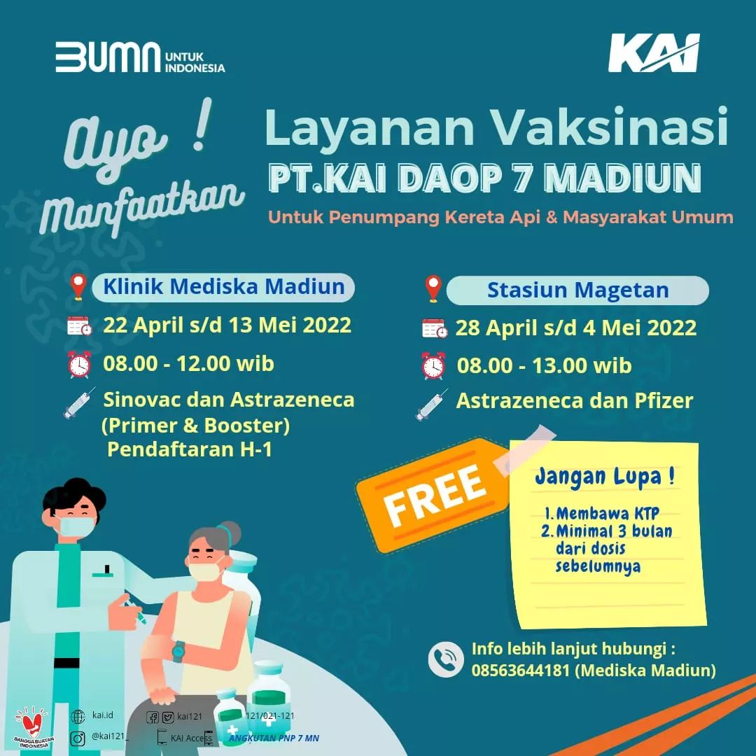 Ayo manfaat kan layanan vaksinasi PT. KAI DAOP 7 Madiun, untuk penumpang kereta api dan masyarakat umum