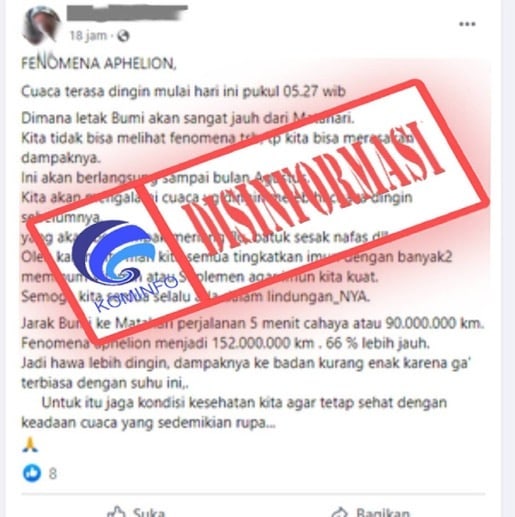 Beberapa hari ini kita merasakan cuaca dingin yang lebih dari pada hari biasannya. Di media sosial, terdapat postingan bahwa cuaca lebih dingin tersebut diakibatkan oleh fenomena aphelion, narasi tersebut kemudian menyebutkan bahwa cuaca terasa lebih dingin diawal bulan Januari hingga bulan Agustus 2022 mendatang. Menurut narasi tersebut hal ini dikarenakan posisi Bumi yang sangat berada jauh dari Matahari. Benarkah narasi tersebut Sobatkom, mari kita telusur bersama.