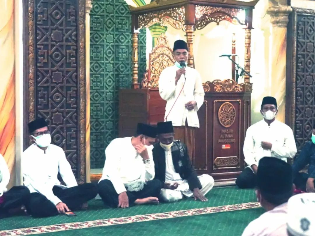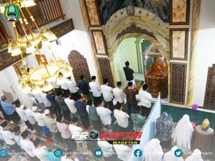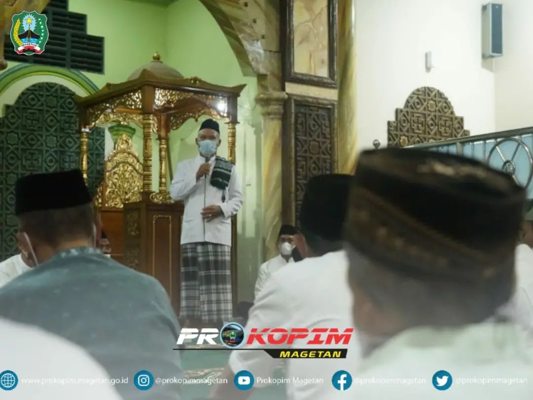 Di hari kedua safari ramadhan, Bupati Suprawoto beserta rombongan mengikuti sholat tarawih bersama masyarakat bertempat di Masjid Al Iman, Desa Panggung, Kecamatan Barat, eks distrik Maospati, Sabtu (09/04/2022).