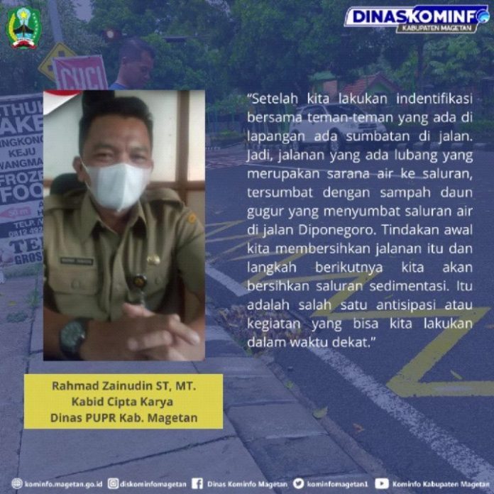 Dalam identifikasi di lapangan, banjir di Jalan Diponegoro disebabkan oleh tertutupnya saluran drainase karena daun-daun kering yang rontok, sebagai langkah awal jalan dan saluran drainase dibersihkan dari sampah daun. Untuk selanjut nya saluran-saluran tersebut juga akan dibersihkan dari sedimentasi.