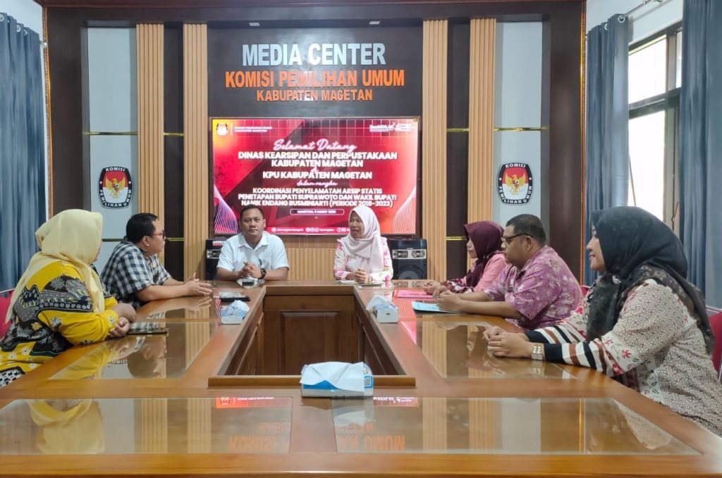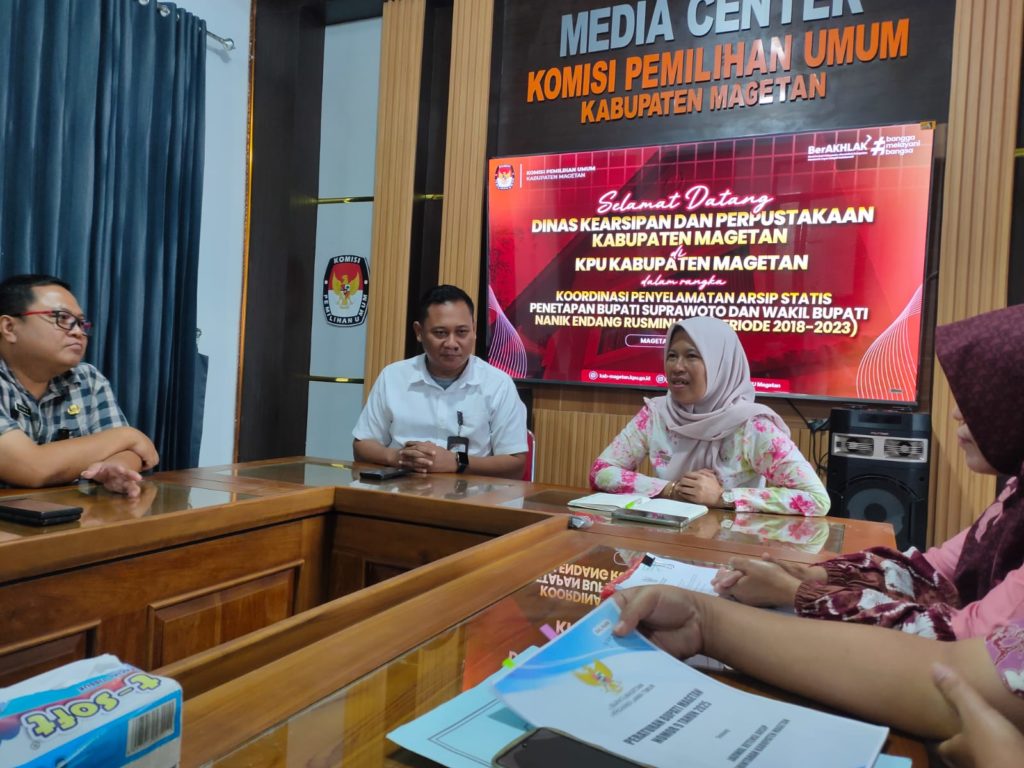 Sebagai Lembaga Kearsipan Daerah (LKD), Dinas Arpus Kab. Magetan mempunyai tanggungjawab besar terkait tata kelola kearsipan di lingkup pemerintah kabupaten Magetan. Pengelolaan arsip statis menjadi salah satu aspek yang perlu mendapat perhatian utama. Terlebih terhadap arsip-arsip yang bernilai strategis dan kesejarahan. Dalam rangka memenuhi amanah tersebut, pada Kamis 5 Maret 2026 Tim dari Dinas Arpus Kab. Magetan berkoordinasi ke KPUD Kab. Magetan sebagai komunikasi awal untuk penyelamatan Arsip statis Penetapan Bupati dan Wakil Bupati Magetan Periode 2018–2023. Dipimpin Kepala Bidang Pengelolaan, Pembinaan dan Pengawasan Kearsipan, Teti Dwi Ratnasari, Tim Arsiparis Dinas Arpus diterima langsung oleh Ketua KPUD Kab. Magetan, Noviano Suyide, didampingi sekretaris KPUD Ervan Rivai beserta pejabat lainnya di ruang Media Center KPUD Kab. Magetan.