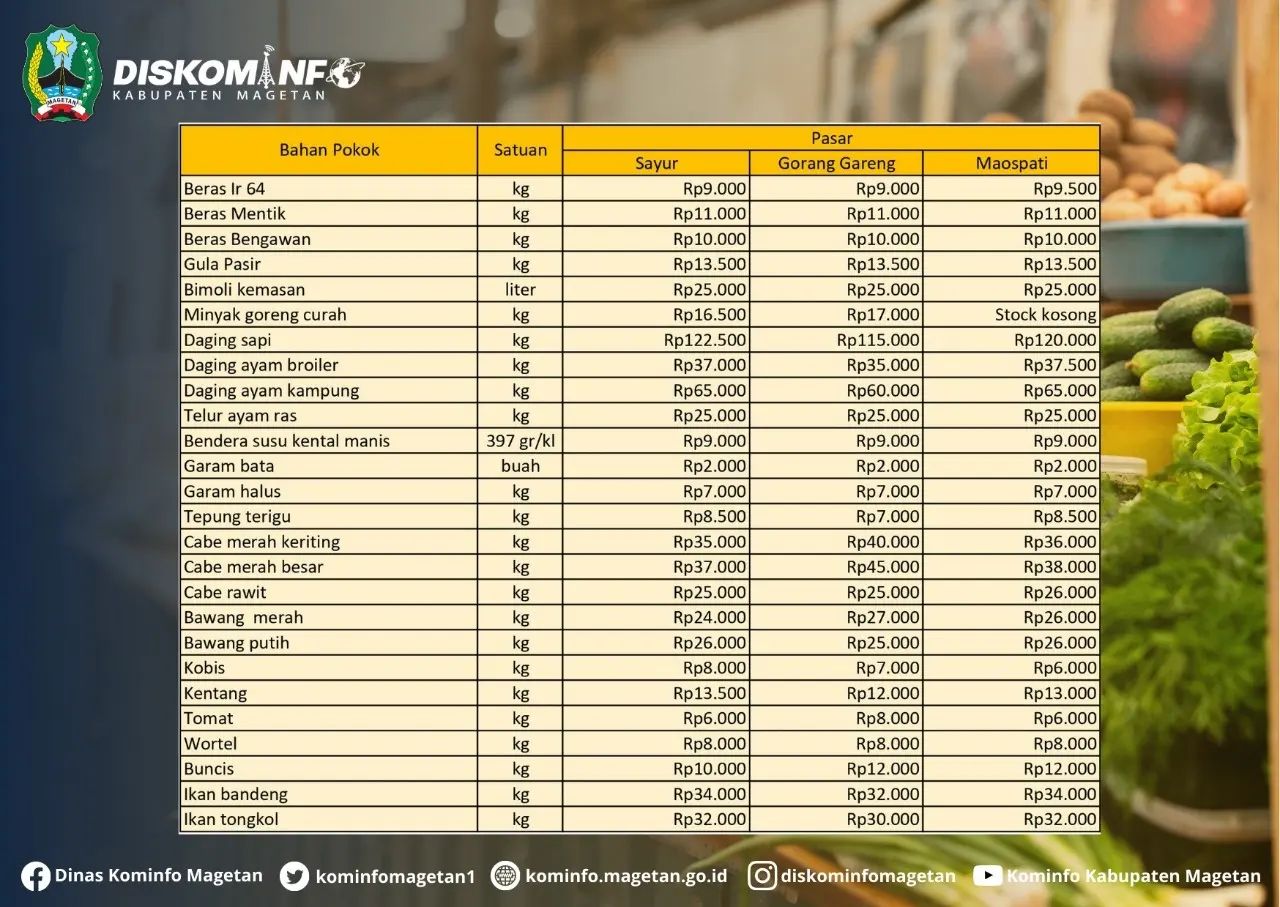 dalam mengupayakan menjaga stabilitas ekonomi daerah, Pemkab. Magetan melalui Dinas Perindustrian dan Perdagangan melakukan pemantauan harga bahan pokok di 3 pasar Kabupaten Magetan. Pemantauan harga dilakukan di tiga pasar di Magetan, yaitu Pasar Pasar Sayur, Pasar Kawedanan dan Pasar Maospati.