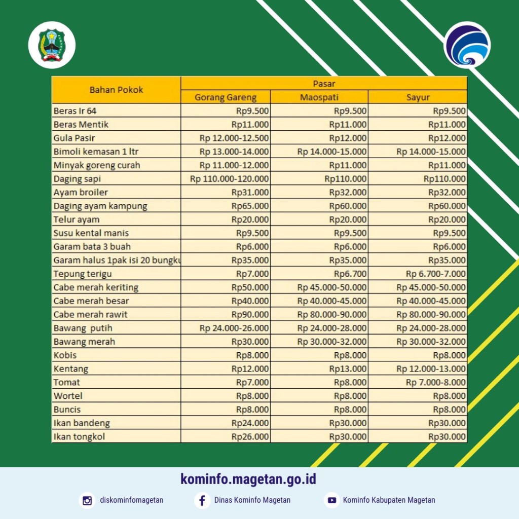 Adapun Data harga bahan pokok Pasar Sayur Magetan pada Senin (30/3), meliputi :
