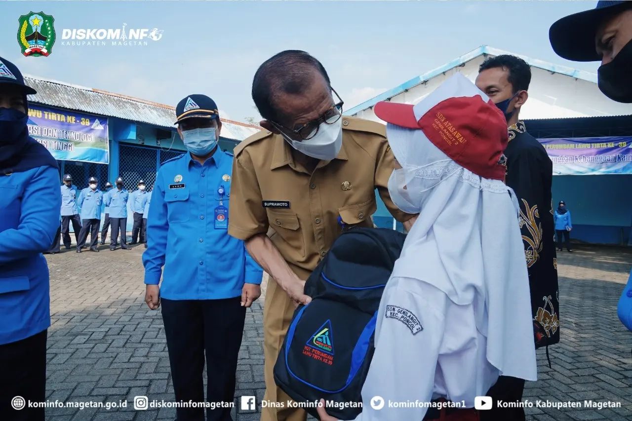 Pada acara ini Bupati Suprawoto juga berkesempatan menyerahkan bantuan secara simbolis, dan meresmikan program unggulan Perumdam Lawu Tirta, Command Center.