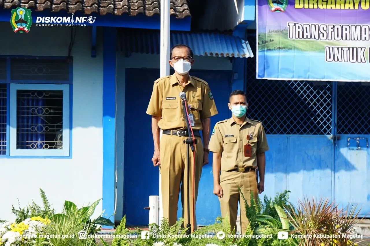 Turut hadir dalam upacara peringatan HUT Perumdam Lawu Tirta ke-39, Wakil Bupati Magetan, Sekretaris Daerah Kabupaten Magetan, Kepala OPD terkait, dan seluruh karyawan Perumdam Lawu Tirta. Upacara peringatan ini diadakan di lapangan barat Perumdam Lawu Tirta, Selasa (10/5).(Diskominfo:nin/fa2/IKP1)