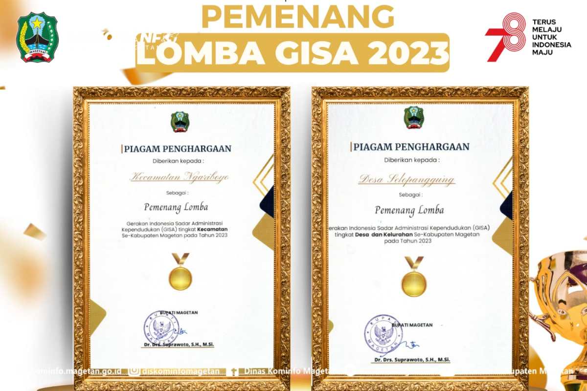 Rekapitulasi penilaian Lomba Gerakan Indonesia Sadar Adminduk (GISA) tahun 2023 telah rampung digarap oleh Disdukcapil Magetan. Hasil rekapitulasi memunculkan nama Kecamatan Ngariboyo dan Desa Selopanggung di Kecamatan Ngariboyo sebagai pemenang Lomba GISA di tingkat Kecamatan dan Desa/Kelurahan.