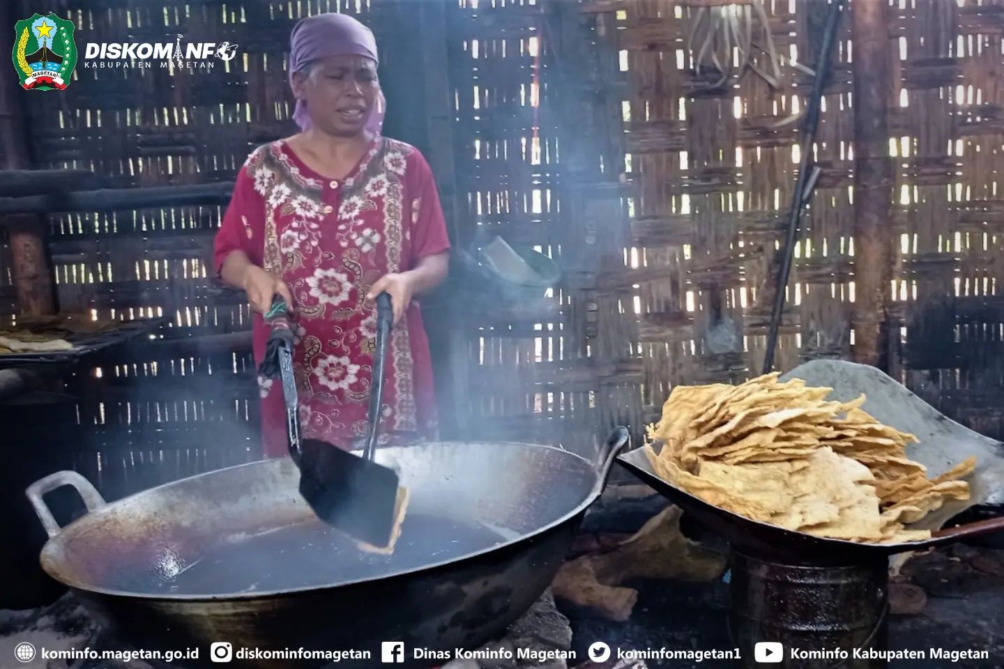 Di belakang Eni, tangan Ibu Painem terlihat memainkan serok untuk menjaga agar kepingan lempeng mentah yang meliuk-liuk karena mengembang di tengah minyak goreng yang mendidih, tetap matang dengan warna kuning kecoklatan.