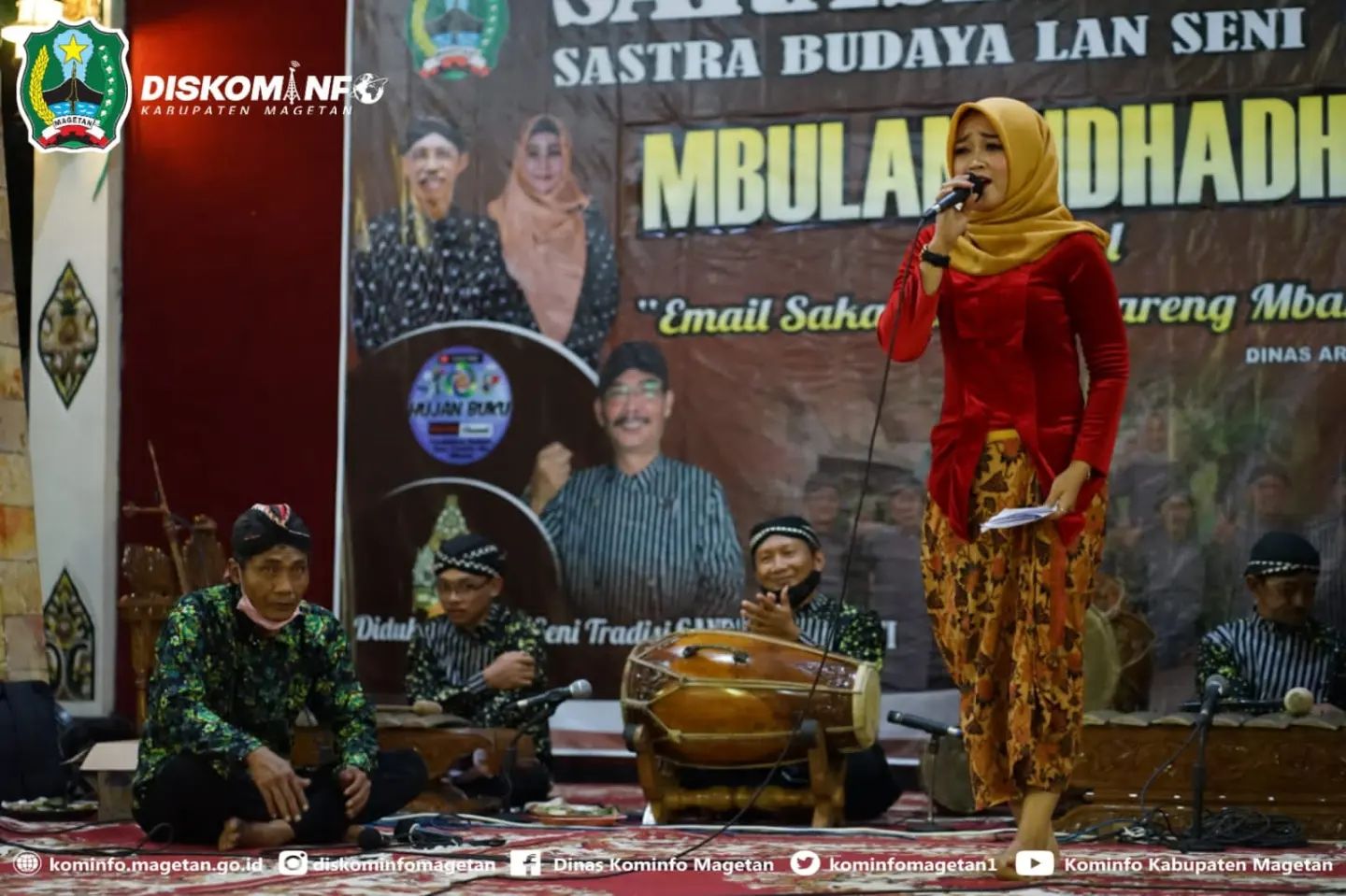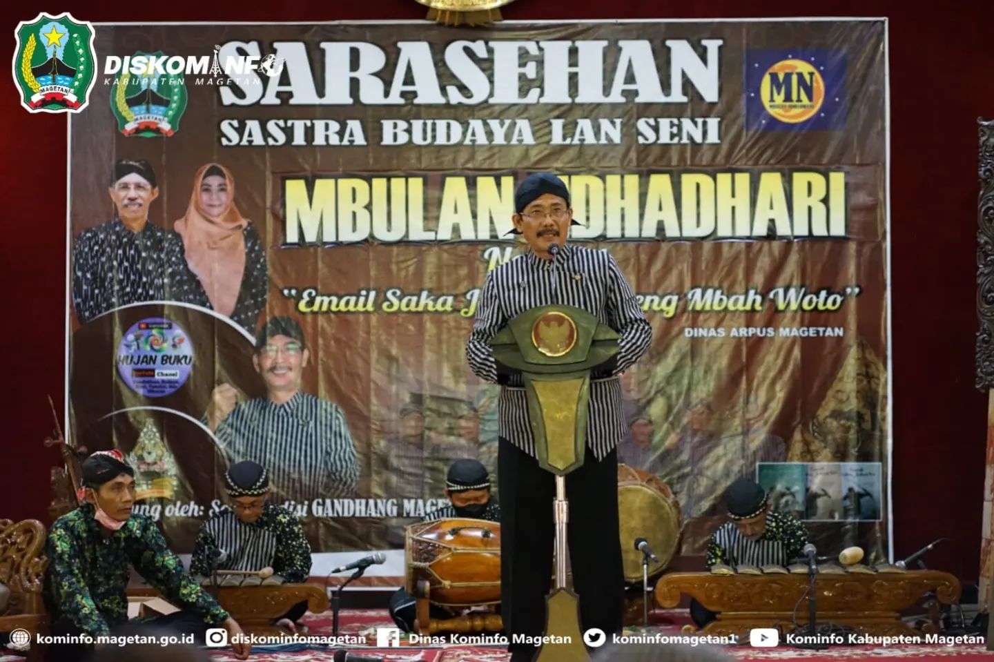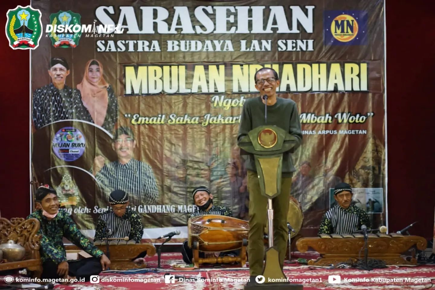 Kepala Dinas Arsip dan Perpustakaan Suhardi dalam laporannya menyampaikan maksud dari penyelengaraan mbulan ndhadari dengan judul ” Ngobrol Email Saka Jakarta Bebarengan Mbah Woto ” adalah sebagai upaya aktif dari semua dalam mendukung visi misi Magetan sebagai kabupaten literasi sedangkan tujuanya untuk menguatkan literasi masyarakat,melestarikan dan menguatkan kecintaan terhadap budaya lokal magetan dan untuk memberikan ruang dan memfasilitasi para pelaku seni di Kabupaten Magetan.” terangnya.