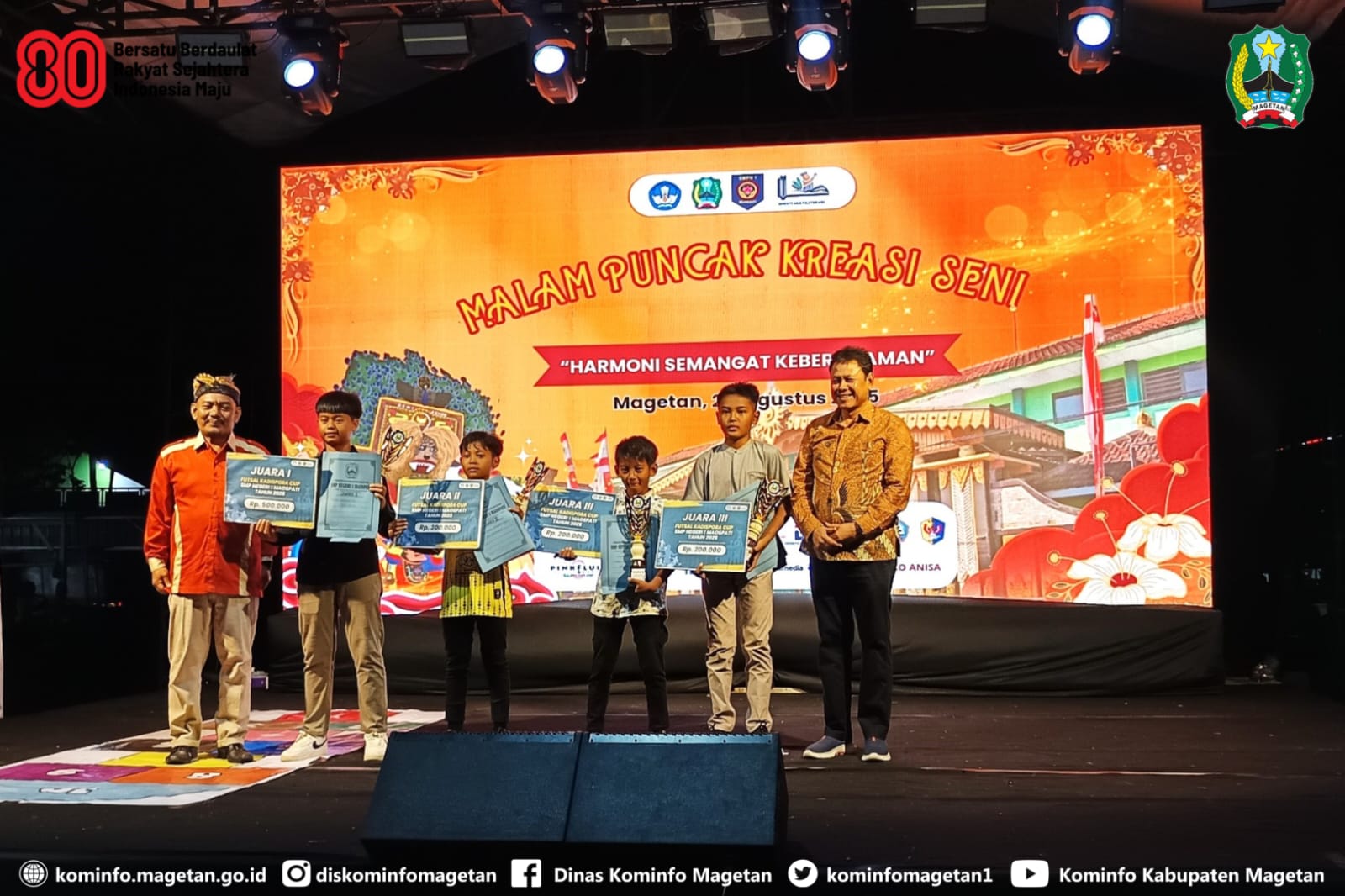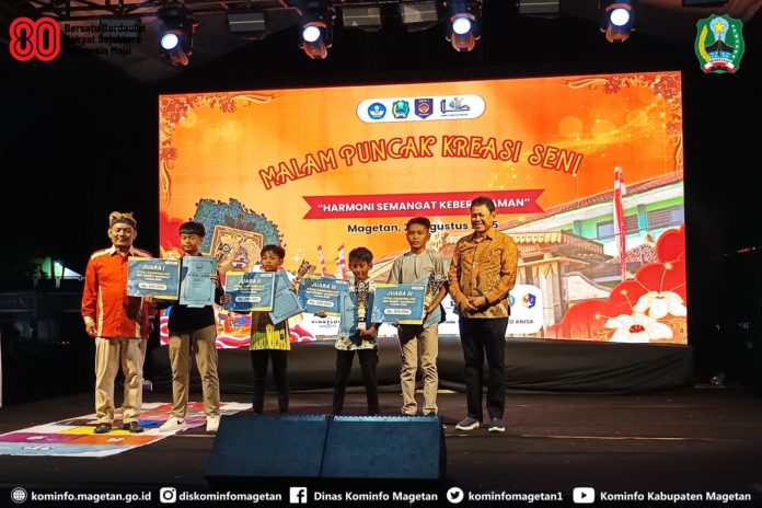 Tak hanya melibatkan guru dan siswa, dalam kegiatan peringatan HUT ke-80 Republik Indonesia dan HUT ke-68 Snesti terwujud berkat kolaborasi dengan komite sekolah, wali murid, serta dukungan sponsor. Selama hampir tiga minggu, SMPN 1 Maospati menggelar beragam kegiatan: lomba internal, jalan santai, partisipasi dalam karnaval kecamatan hingga pawai budaya di tingkat kabupaten. “Puncaknya malam ini. Kami ingin memfasilitasi siswa mengembangkan bakat dan talentanya. Termasuk kerawitan, ini hal baru. Tahun ini kami berhasil mewujudkan alat gamelan berkat sharing dengan wali murid. Anak-anak tampil luar biasa,” tambahnya.