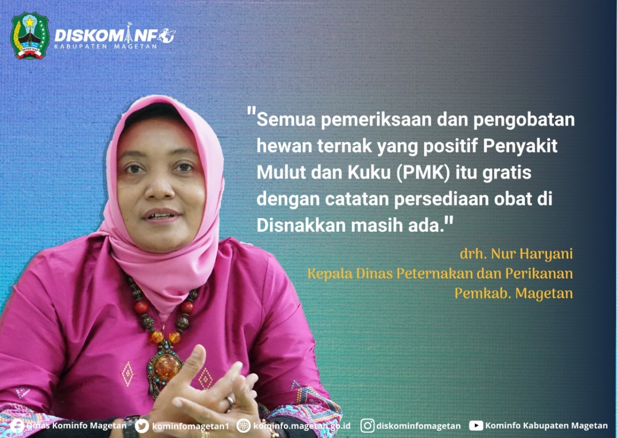 “Semua pemeriksaan dan pengobatan hewan ternak yang positif Penyakit Mulut dan Kuku (PMK) itu gratis dengan catatan persediaan obat di Disnakkan masih ada,” ungkap Kepala Dinas Peternakan dan Perikanan (Disnakkan) Pemkab. Magetan, drh. Nur Haryani saat ditemui, Sabtu (28/5/2022).