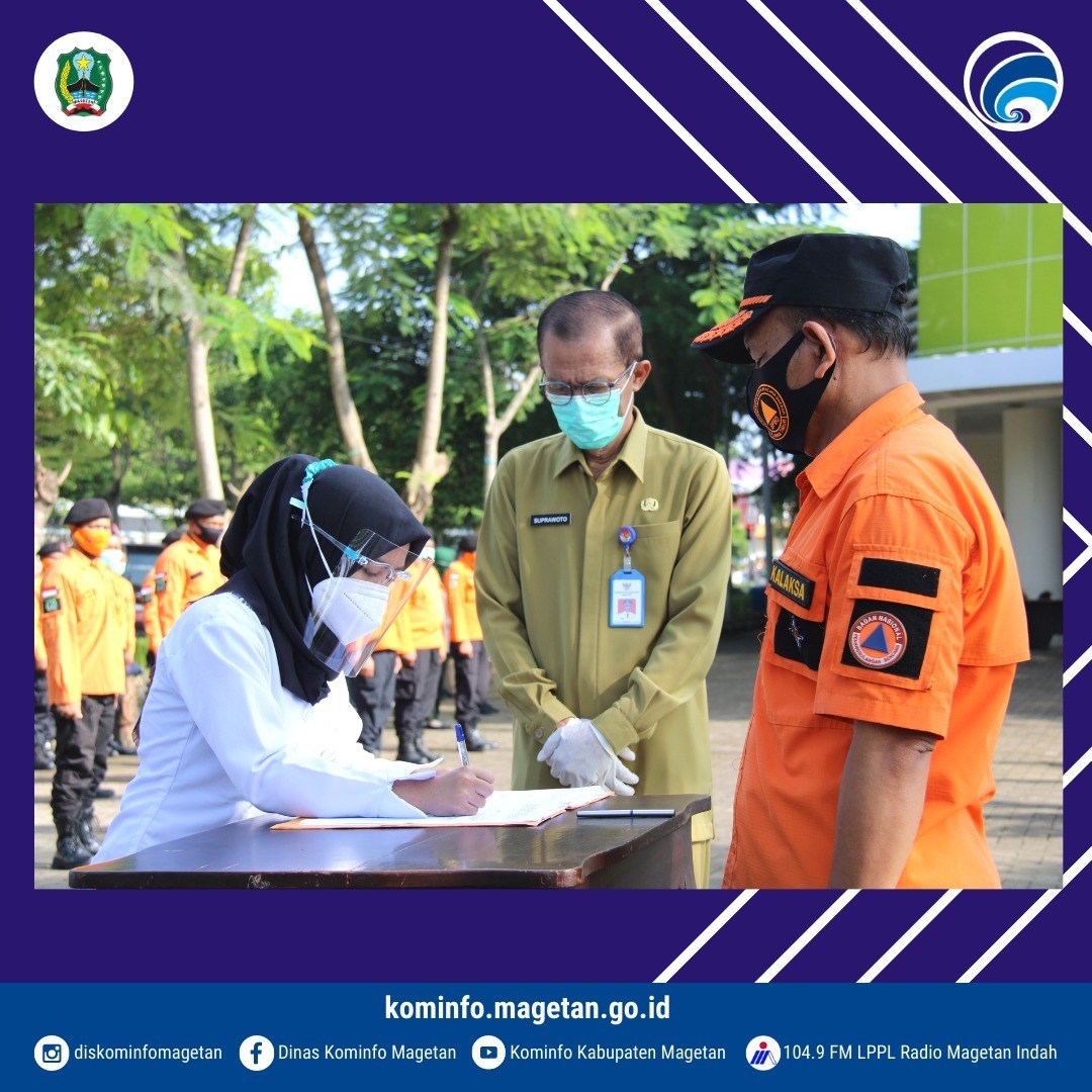Bupati Magetan, Suprawoto pimpin upacara Penandatanganan Penjanjian Kerja Relawan Profesional Kesehatan Penanggulangan Covid-19 Kabupaten Magetan Tahun 2021 di Posko Satgas Penanggulangan COVID-19 dan Pendisiplinan Protokol Kesehatan, Jl. Yosonegoro No. 1 pada Senin (22/2/2021) pukul 08.00 WIB. Hadir pula Wakil Bupati, Sekda, Asisten I, Asisten III, Kepala BKD, Kepala Dinas Kesehatan, Direktur RSUD. Sayidiman, Kepala Pelaksana BPBD Kabupaten Magetan.