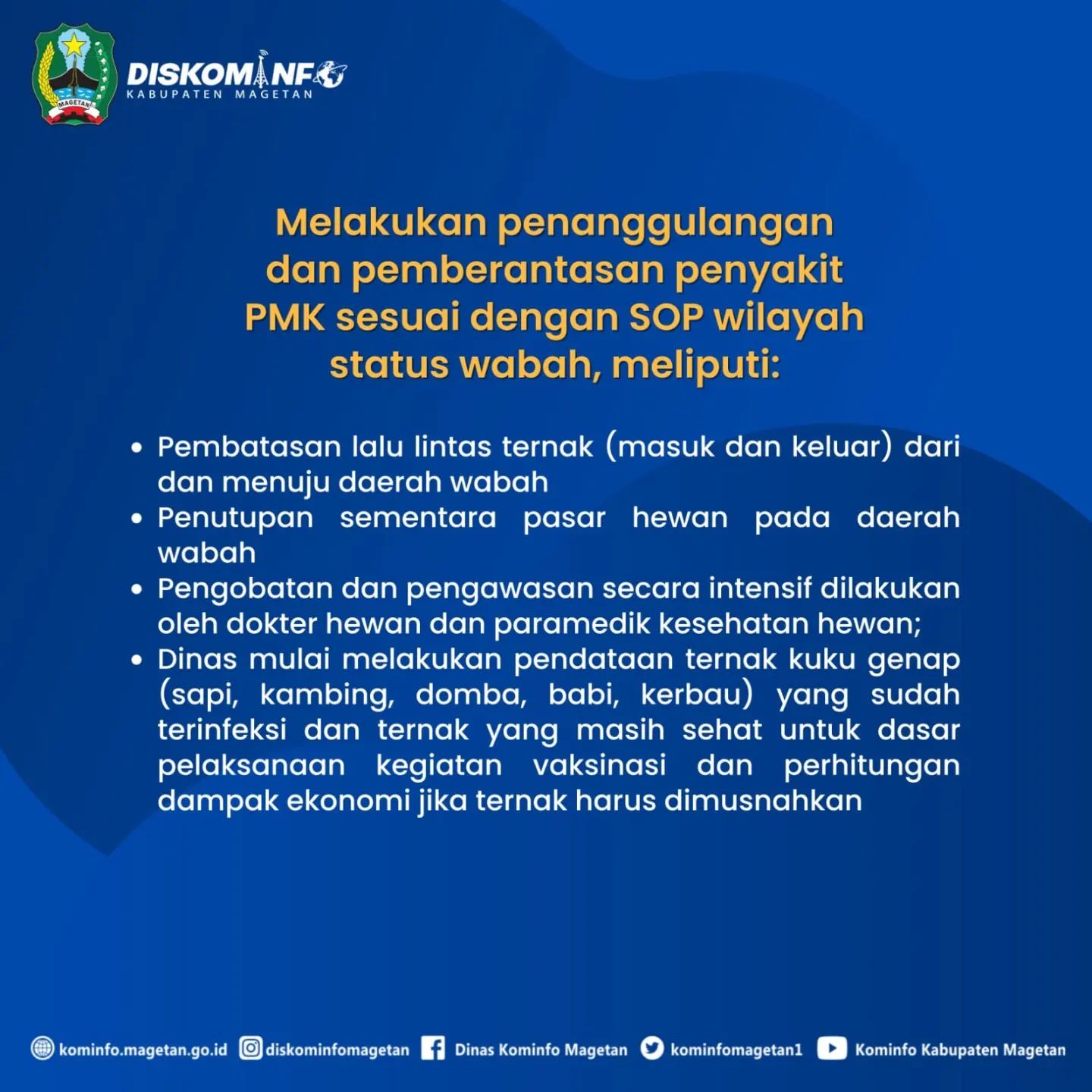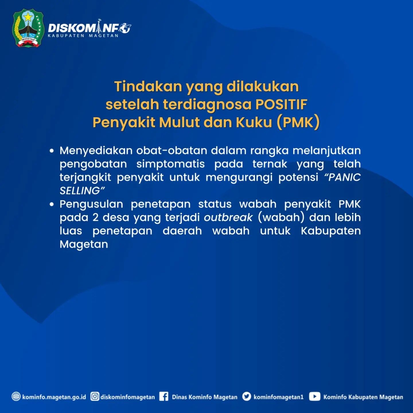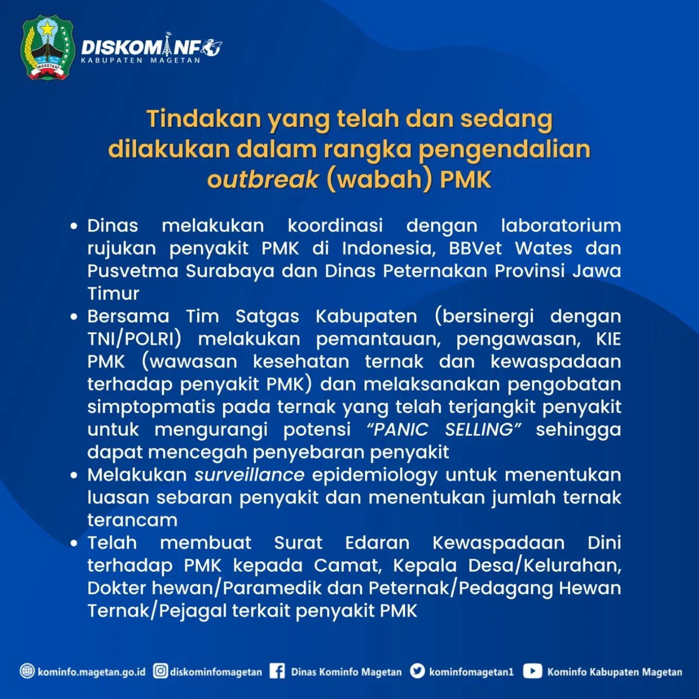 Penyakit Mulut dan Kuku (PMK) pada hewan ternak telah menjadi perhatian khusus bagi Pemerintah Kabupaten Magetan, khususnya Dinas Peternakan dan Perikanan. Beberapa kebijakan telah diambil dan dilakukan untuk meminimalisir penyebaran virus tersebut.
