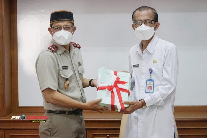 Penyerahan secara simbolis sertipikat tanah Pemerintah Daerah Kabupaten Magetan oleh Badan Pertanahan Nasional (BPN) digelar di Ruang Rapat Pendapa Surya Graha, Rabu, (25/05/2022).