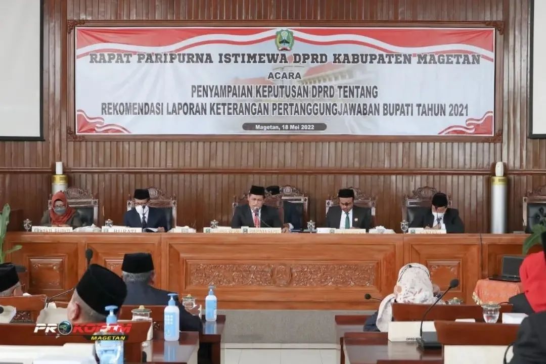 Bupati Magetan Suprawoto menghadiri rapat paripurna istimewa dengan acara pokok, Penyampai Keputusan DPRD Tentang Rekomendasi Laporan Keterangan Pertanggungjawaban Bupati Tahun Anggaran 2021, bertempat di Ruang Rapat Paripurna Gedung DPRD Magetan, Rabu, (18/5).