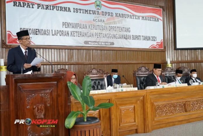 Bupati Magetan Suprawoto menghadiri rapat paripurna istimewa dengan acara pokok, Penyampai Keputusan DPRD Tentang Rekomendasi Laporan Keterangan Pertanggungjawaban Bupati Tahun Anggaran 2021, bertempat di Ruang Rapat Paripurna Gedung DPRD Magetan, Rabu, (18/5).