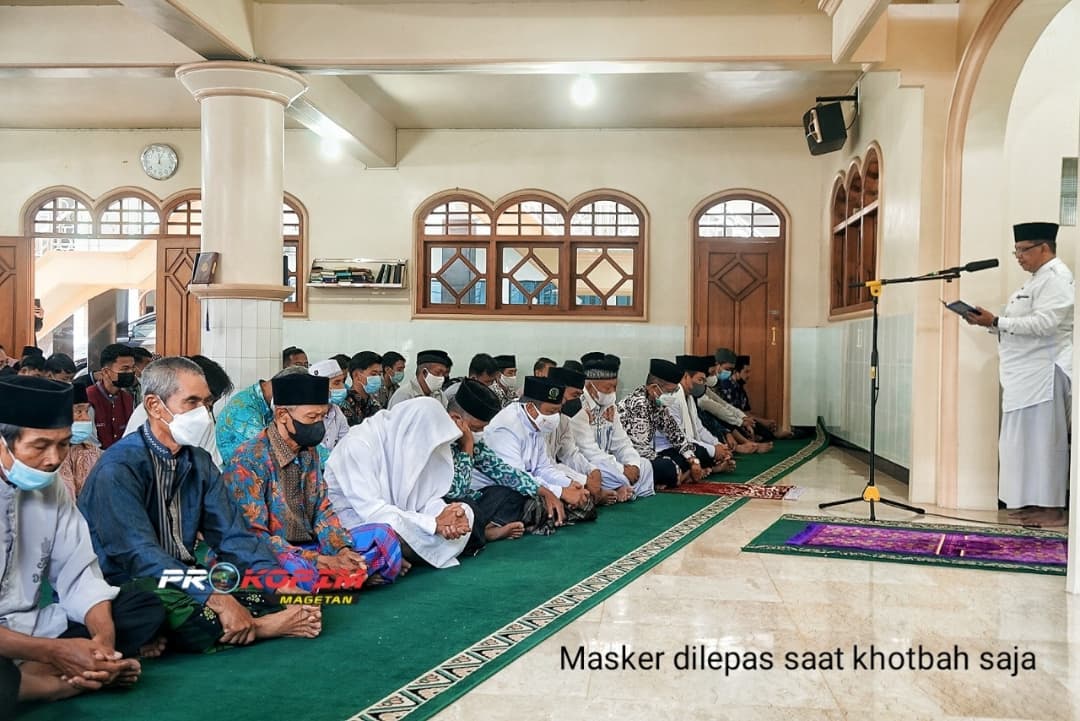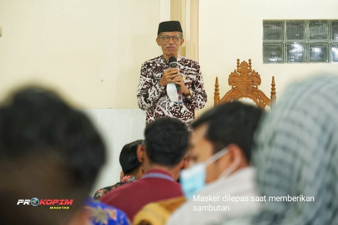 Selesai melaksanakan salat Jum’at dilanjutkan sambutan Bupati Magetan. Dalam sambutannya Suprawoto meminta maaf jika selama pandemi Covid-19 yang kemarin belum bisa dikendalikan sehingga belum bisa berkumpul dan bersilaturahmi, kesemuanya itu wujud cintanya kepada masyarakat untuk saling menjaga. ” Sesuai dengan dawuh Kanjeng Nabi Muhammad SAW pada masa itu ketika terjadi pandemi, Beliau bersabda “Apabila kalian mendengar suatu daerah terjadi pandemi jangan masuk, dan apabila kamu ada di dalamnya janganlah keluar “, ungkap Bupati Magetan.