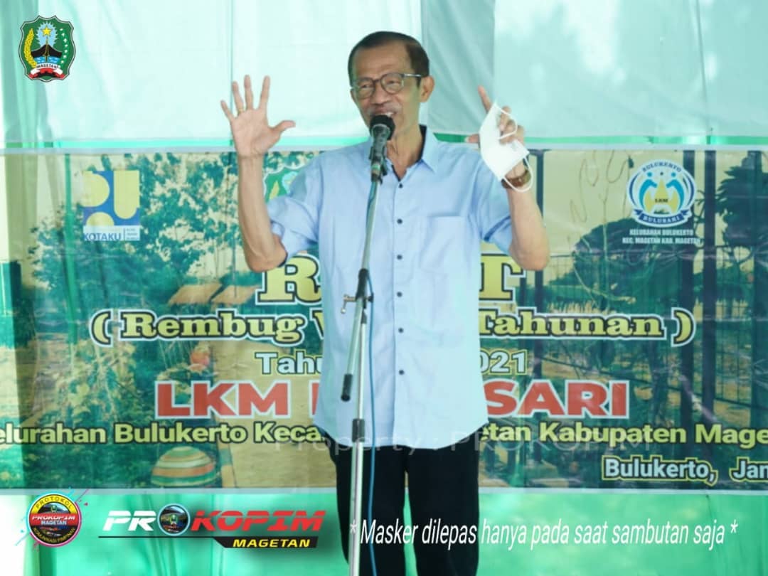 Bupati Suprawoto dalam arahannya menyampaikan rasa bangga dengan LKM Bulusari ini karena sesuai dengan visi dan misi Magetan terdepan. ” Saya bangga dengan LKM ini karena sesuai visi Magetan. Kita semua tentunya tidak rela jika Magetan disepelekan oleh Kabupaten lain. Suatu saat kalau Magetan ini maju kelurahan Bulukerto ini harus menjadi bagian terpenting dari kemajuan ini,” terangnya.