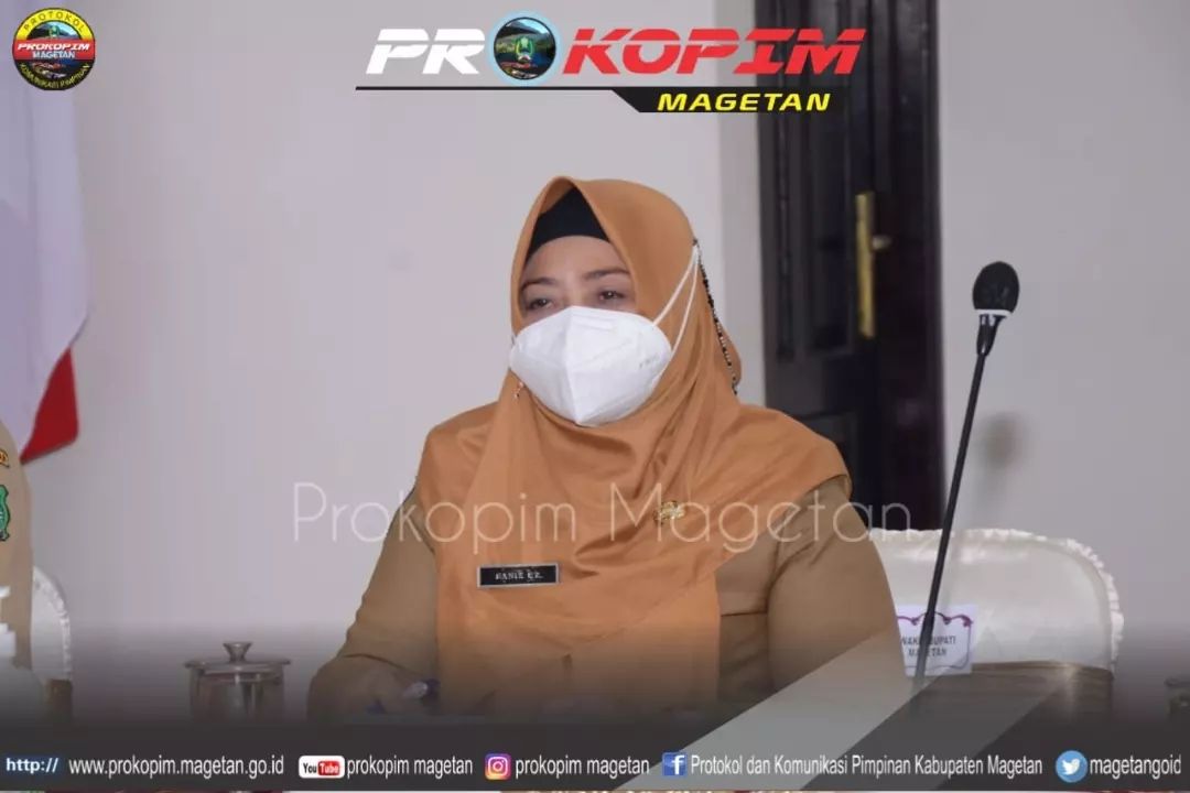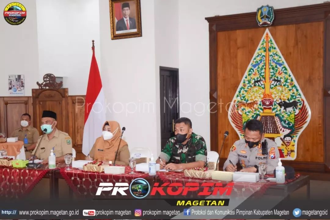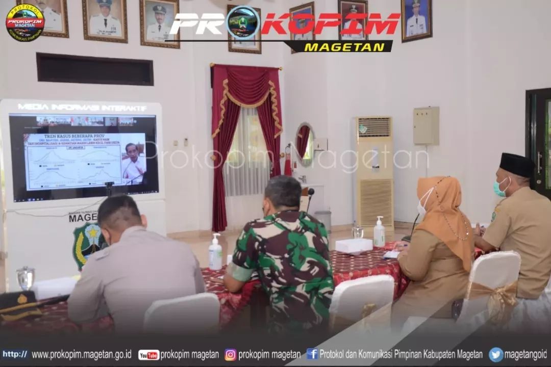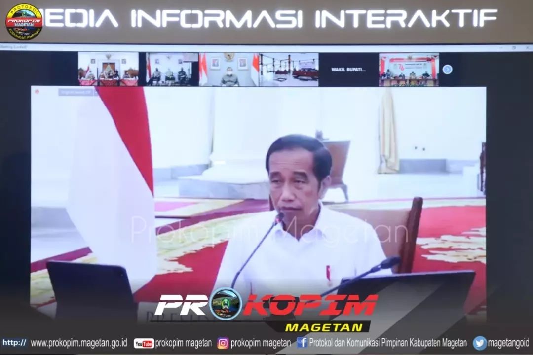 Sahabat Prokopim… Presiden Joko Widodo memberikan arahan secara virtual kepada Gubernur, Bupati dan Walikota se- Indonesia, Senin (7/2/2022). Wakil Bupati Magetan, Nanik Endang Rusminiarti, Kapolres, Komandan Kodim 0804 dan pimpinan OPD terkait mengikuti dari ruang jamuan Pendapa Surya Graha.