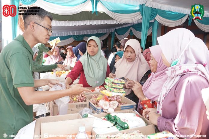 Memeriahkan Hari Ulang Tahun (HUT) ke-80 Kemerdekaan Republik Indonesia, Pemerintah Kabupaten Magetan gelar Pasar Murah Gerakan Pangan Murah (GPM) pada Sabtu (30/8/2025) di halaman Kantor Desa Sidorejo, Kecamatan Sidorejo