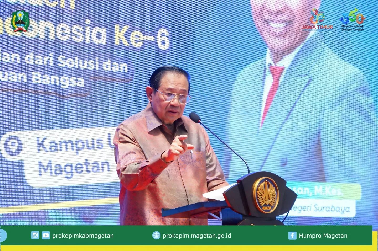 Dalam rangka meningkatkan wawasan kebangsaan, kepemimpinan, dan integritas civitas akademika, Universitas Negeri Surabaya (UNESA) Kampus Magetan menggelar Kuliah Umum bersama Presiden Republik Indonesia ke-6, Prof. Dr. H. Susilo Bambang Yudhoyono, M.A., pada Sabtu (18/10/2025).