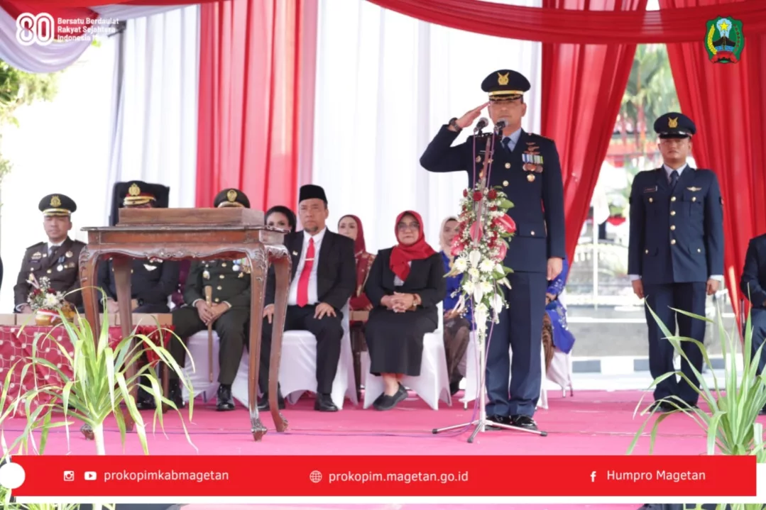 ​Berbagai tokoh penting turut hadir dalam upacara ini, menunjukkan sinergi dan kebersamaan seluruh elemen masyarakat Magetan. Tampak hadir Bupati Magetan, Wakil Bupati Magetan, seluruh jajaran Forkopimda, perwakilan Veteran yang menjadi saksi hidup perjuangan kemerdekaan, tokoh masyarakat, tokoh agama, perwakilan organisasi kemasyarakatan, serta orang tua anggota Paskibraka yang terlihat bangga menyaksikan putra-putri mereka menunaikan tugas negara.
