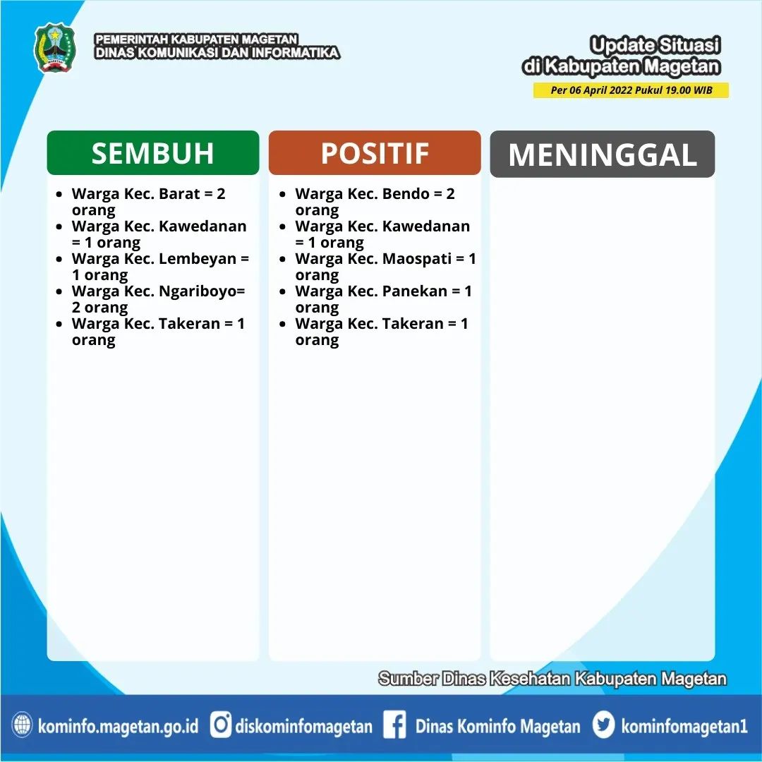Berdasarkan data yang dihimpun dari Dinas Kesehatan Kabupaten Magetan, pasien sembuh COVID-19 pada Rabu (06/04) ada 7 orang. Sedangkan kasus terkonfirmasi COVID-19 pada hari ini sebanyak 6 orang. Serta tidak ada warga yang dinyatakan meninggal dunia akibat COVID-19.