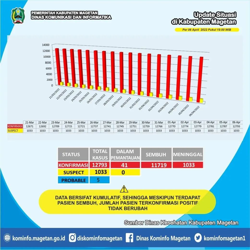 Secara keseluruhan, kasus terkonfirmasi COVID-19 per hari ini adalah 12793 kasus. Di mana, 11719 orang telah sembuh dari COVID-19. Kemudian, 41 orang masih dalam pemantauan. Dan, 1033 orang meninggal dunia. Sedangkan untuk suspect ada 0 orang dalam pemantauan. Serta, ada 5 orang berstatus probable.