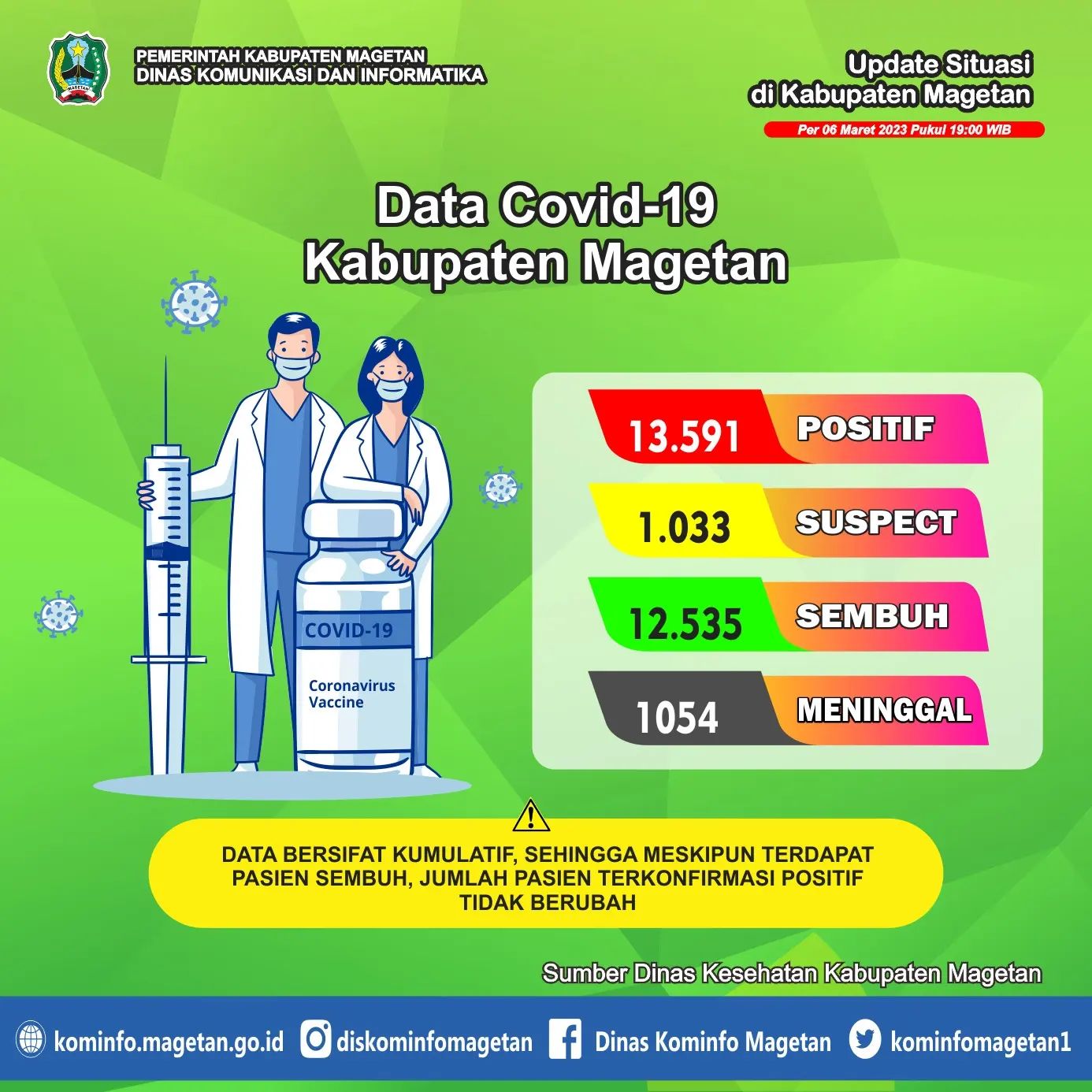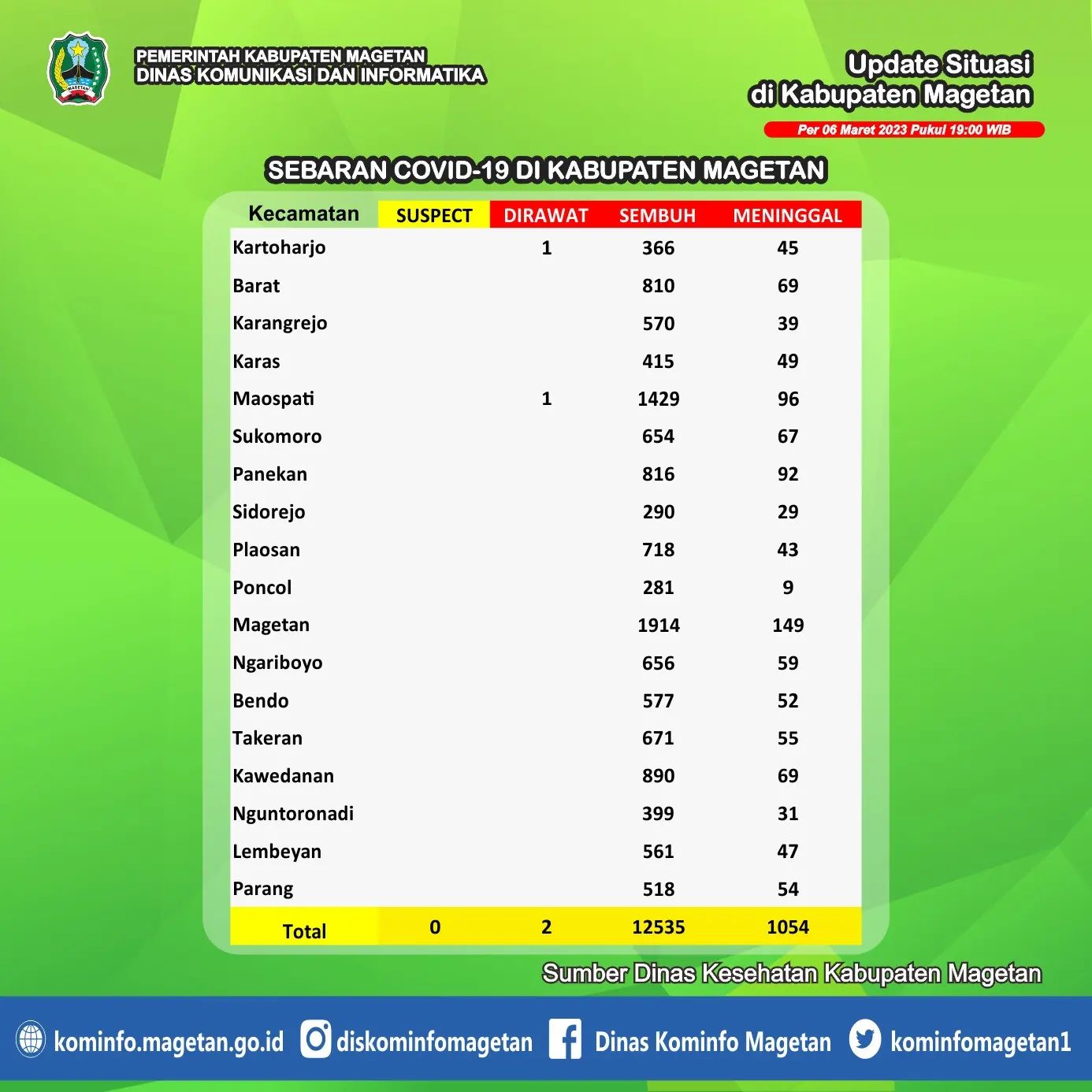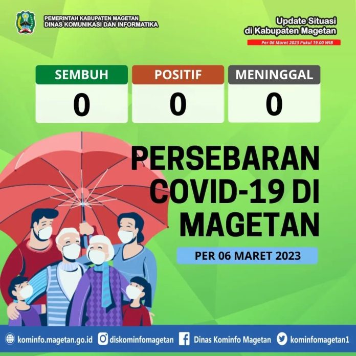 Berdasarkan data yang dihimpun dari Dinas Kesehatan Kabupaten Magetan, pasien sembuh COVID-19 pada Senin (06/03) ada 0 orang. Sedangkan kasus terkonfirmasi COVID-19 pada hari ini ada 0 orang. Serta tidak ada penduduk yang dinyatakan meninggal dunia akibat COVID-19.