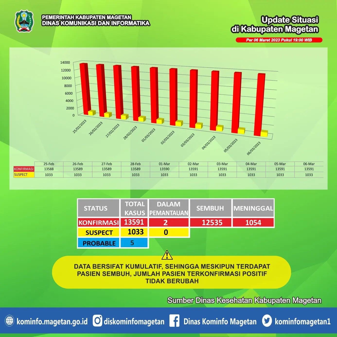 Secara keseluruhan, kasus terkonfirmasi COVID-19 per hari ini adalah 13591 kasus. Di mana, 12536 orang telah sembuh dari COVID-19. Kemudian, ada 1 orang yang tetap dalam pemantauan terkonfirmasi COVID-19. Dan, 1054 orang meninggal dunia. Sedangkan untuk suspect ada 0 orang dalam pemantauan. Serta, ada 5 orang berstatus probable.