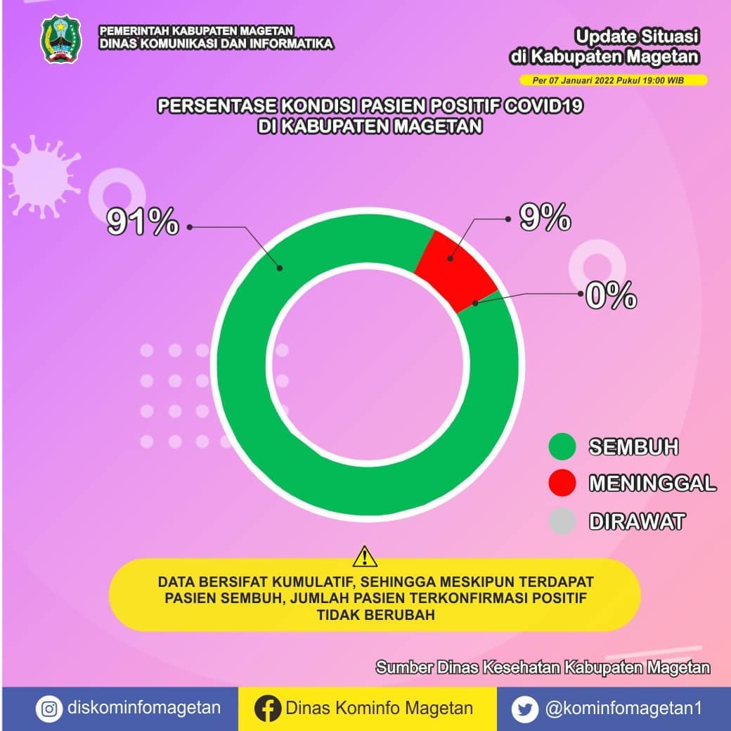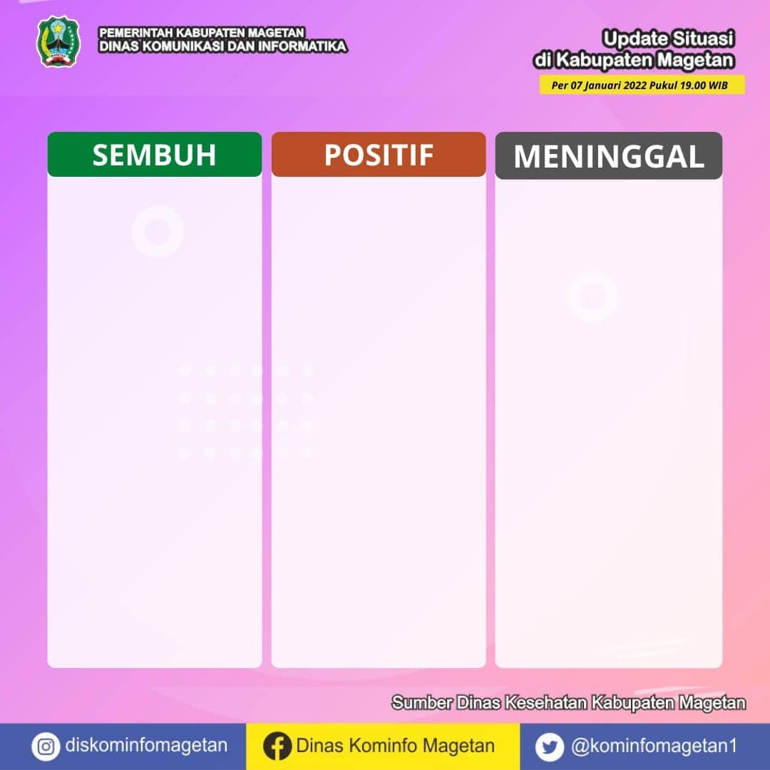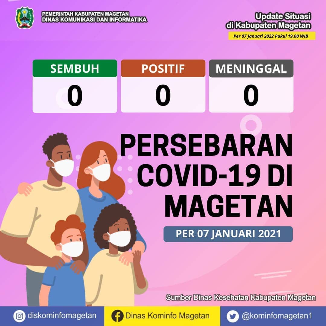 Berdasarkan data yang dihimpun dari Dinas Kesehatan Kabupaten Magetan, pasien sembuh COVID-19 pada Jumat (07/01) ada 0 orang. Sedangkan kasus terkonfirmasi COVID-19 pada hari ini sebanyak 0 orang. Serta tidak ada warga yang dinyatakan meninggal dunia akibat COVID-19.