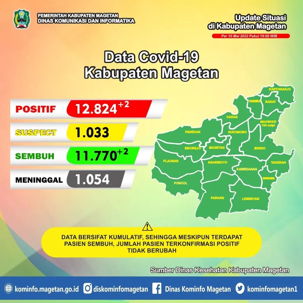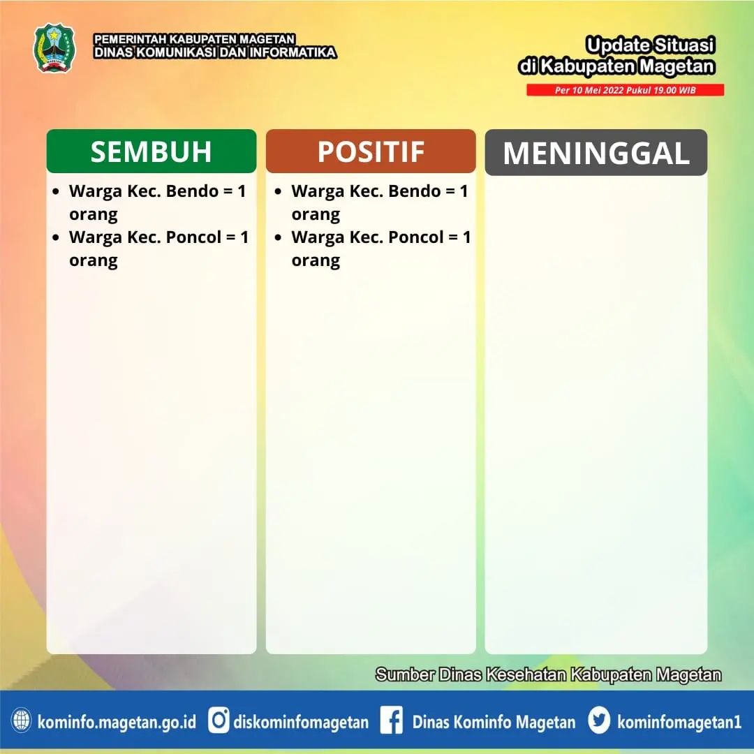 Berdasarkan data yang dihimpun dari Dinas Kesehatan Kabupaten Magetan, pasien sembuh COVID-19 pada Selasa (10/05) ada 2 orang. Sedangkan kasus terkonfirmasi COVID-19 pada hari ini ada 2 orang. Serta tidak ada warga yang dinyatakan meninggal dunia akibat COVID-19.