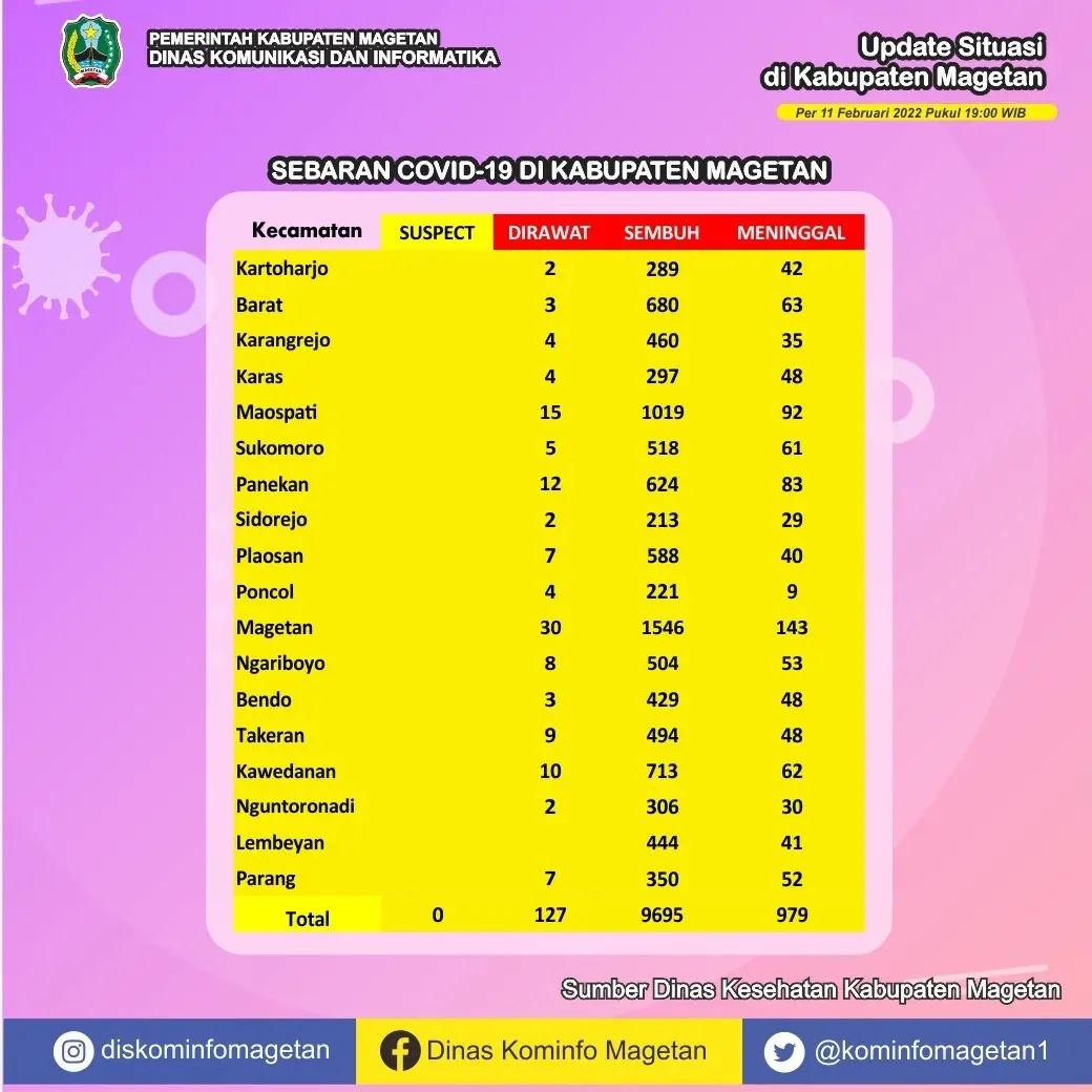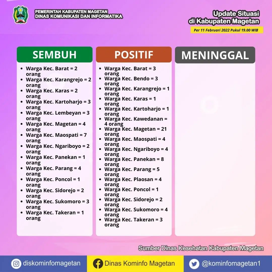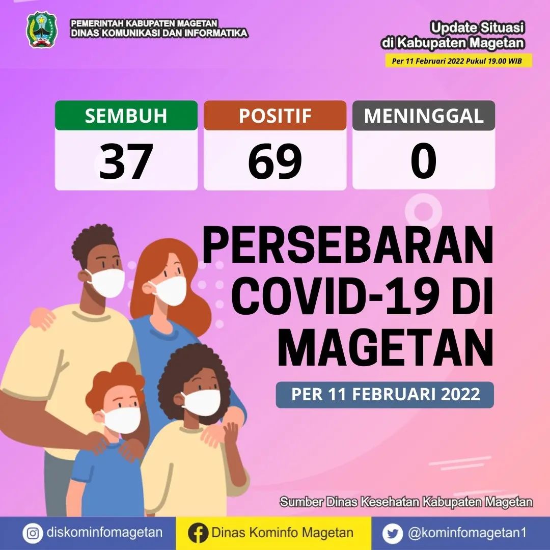 Berdasarkan data yang dihimpun dari Dinas Kesehatan Kabupaten Magetan, pasien sembuh COVID-19 pada Jumat (11/02) ada 37 orang. Sedangkan kasus terkonfirmasi COVID-19 pada hari ini sebanyak 69 orang. Serta tidak ada warga yang dinyatakan meninggal dunia akibat COVID-19.
