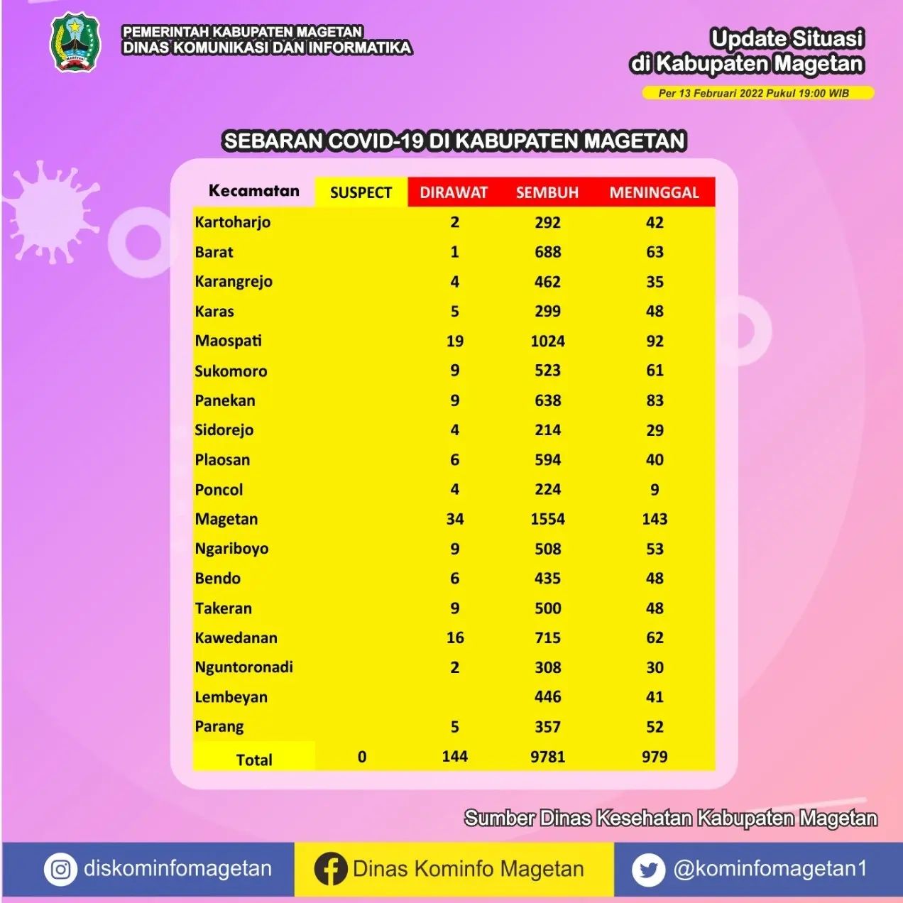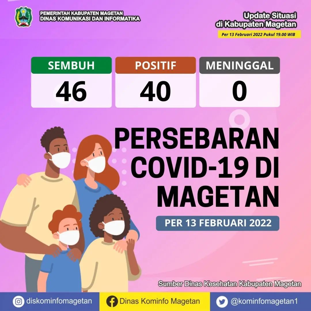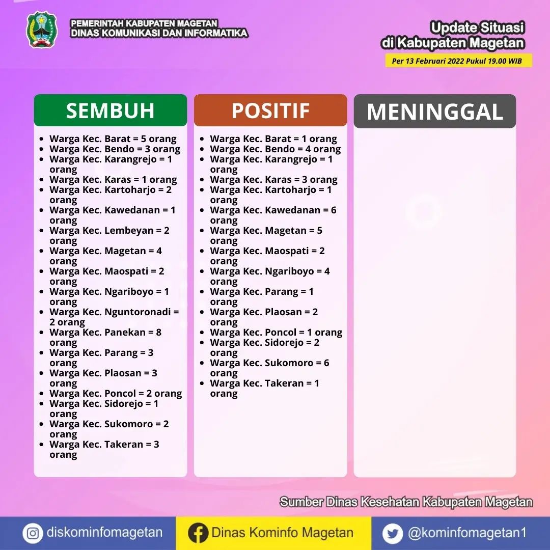 Berdasarkan data yang dihimpun dari Dinas Kesehatan Kabupaten Magetan, pasien sembuh COVID-19 pada Minggu (13/02) ada 46 orang. Sedangkan kasus terkonfirmasi COVID-19 pada hari ini sebanyak 40 orang. Serta tidak ada warga yang dinyatakan meninggal dunia akibat COVID-19.