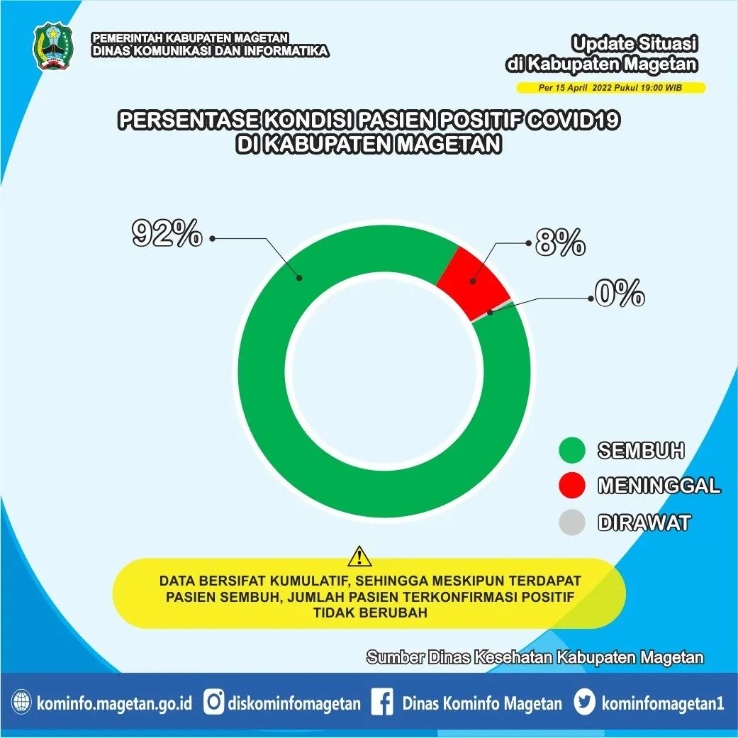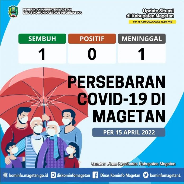 Berdasarkan data yang dihimpun dari Dinas Kesehatan Kabupaten Magetan, pasien sembuh COVID-19 pada Jumat (15/04) ada 1 orang. Sedangkan kasus terkonfirmasi COVID-19 pada hari ini ada 0 orang. Serta seorang warga yang dinyatakan meninggal dunia akibat COVID-19.