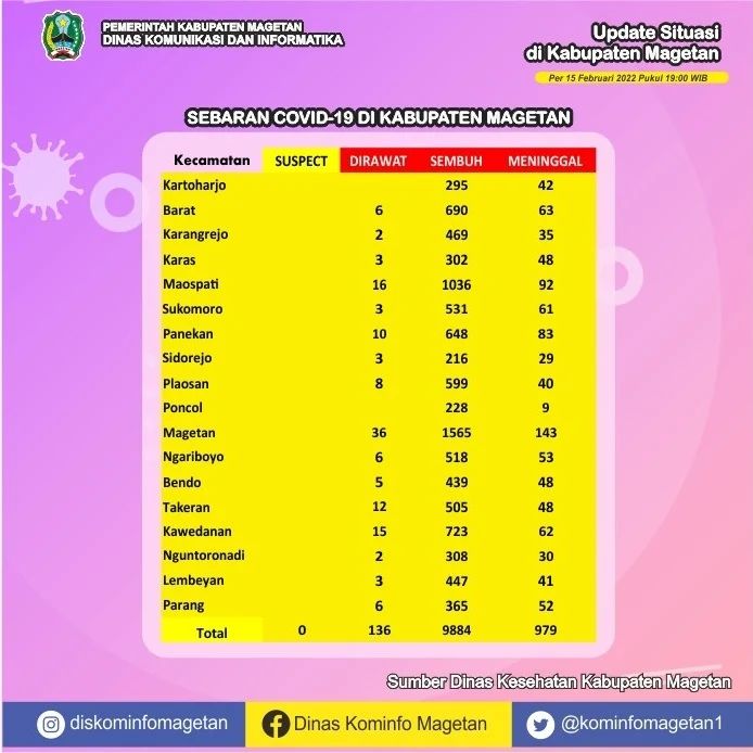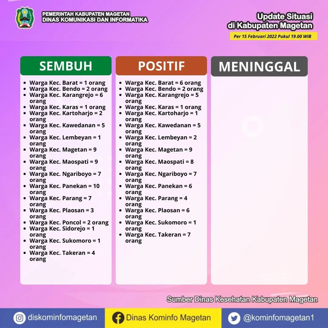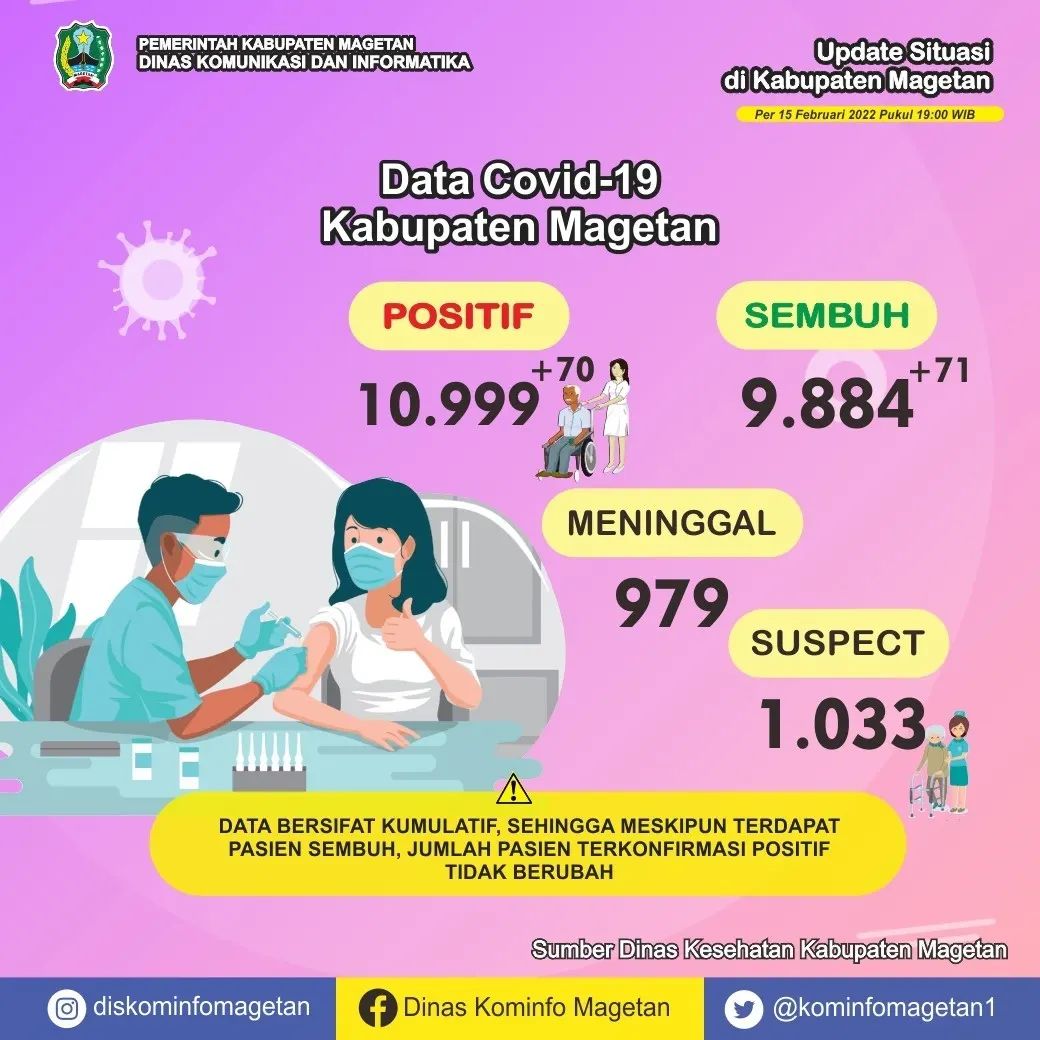 Berdasarkan data yang dihimpun dari Dinas Kesehatan Kabupaten Magetan, pasien sembuh COVID-19 pada Selasa (15/02) ada 71 orang. Sedangkan kasus terkonfirmasi COVID-19 pada hari ini sebanyak 70 orang. Serta tidak ada warga yang dinyatakan meninggal dunia akibat COVID-19.