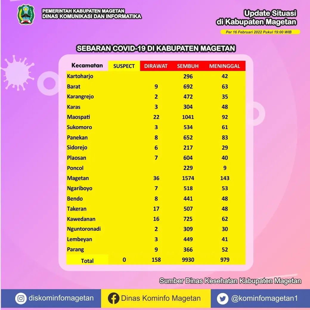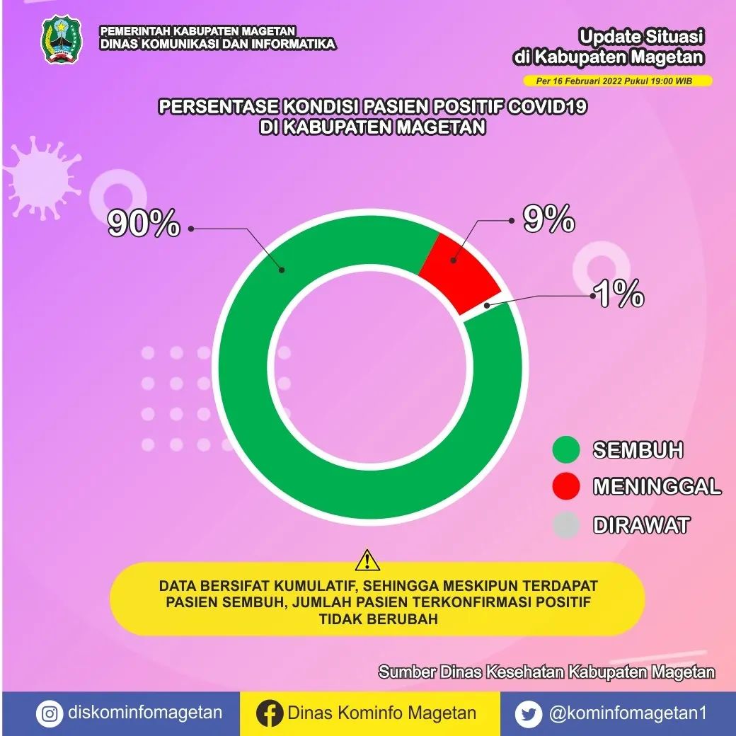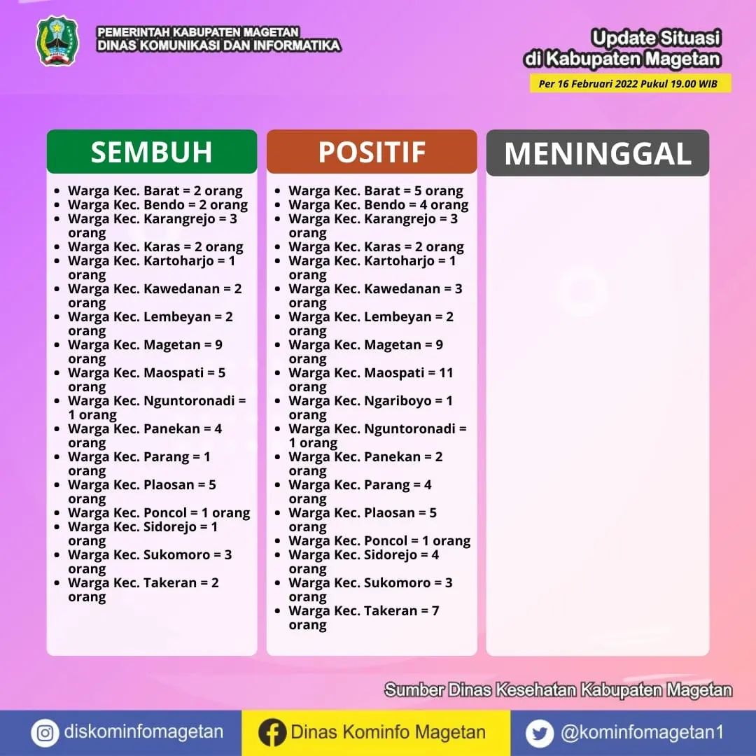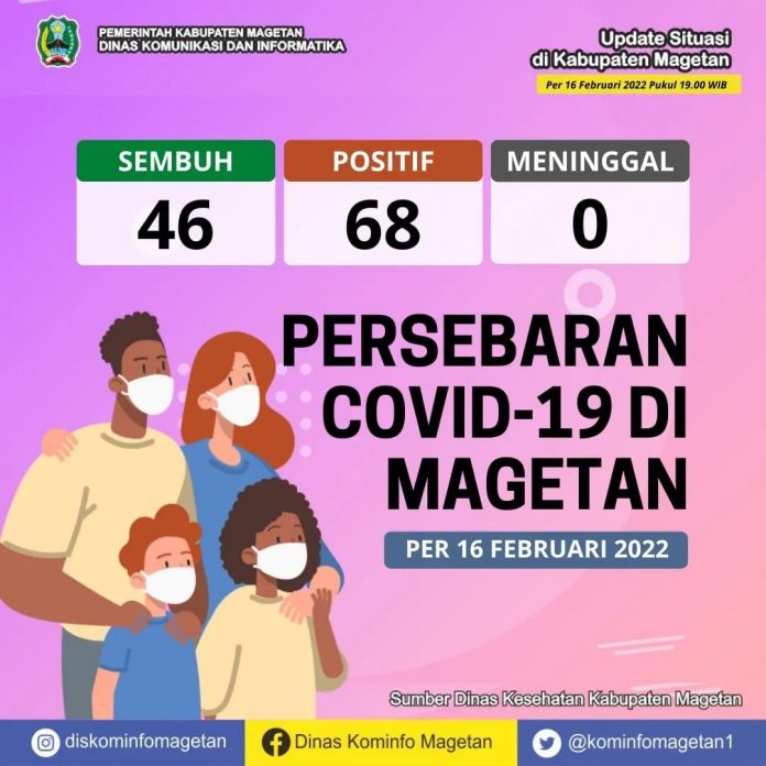 Berdasarkan data yang dihimpun dari Dinas Kesehatan Kabupaten Magetan, pasien sembuh COVID-19 pada Rabu (16/02) ada 46 orang. Sedangkan kasus terkonfirmasi COVID-19 pada hari ini sebanyak 68 orang. Serta tidak ada warga yang dinyatakan meninggal dunia akibat COVID-19.