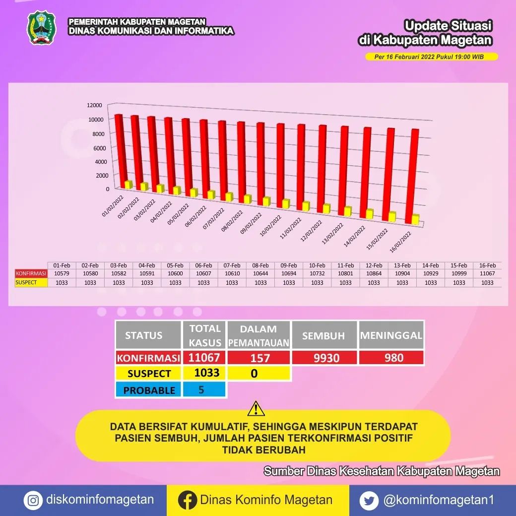 Secara keseluruhan, kasus terkonfirmasi COVID-19 per hari ini adalah 11067 kasus. Di mana, 9930 orang telah sembuh dari COVID-19. Kemudian, 158 orang masih dalam pemantauan. Dan, 979 orang meninggal dunia. Sedangkan untuk suspect ada 0 orang dalam pemantauan. Serta, ada 5 orang berstatus probable.