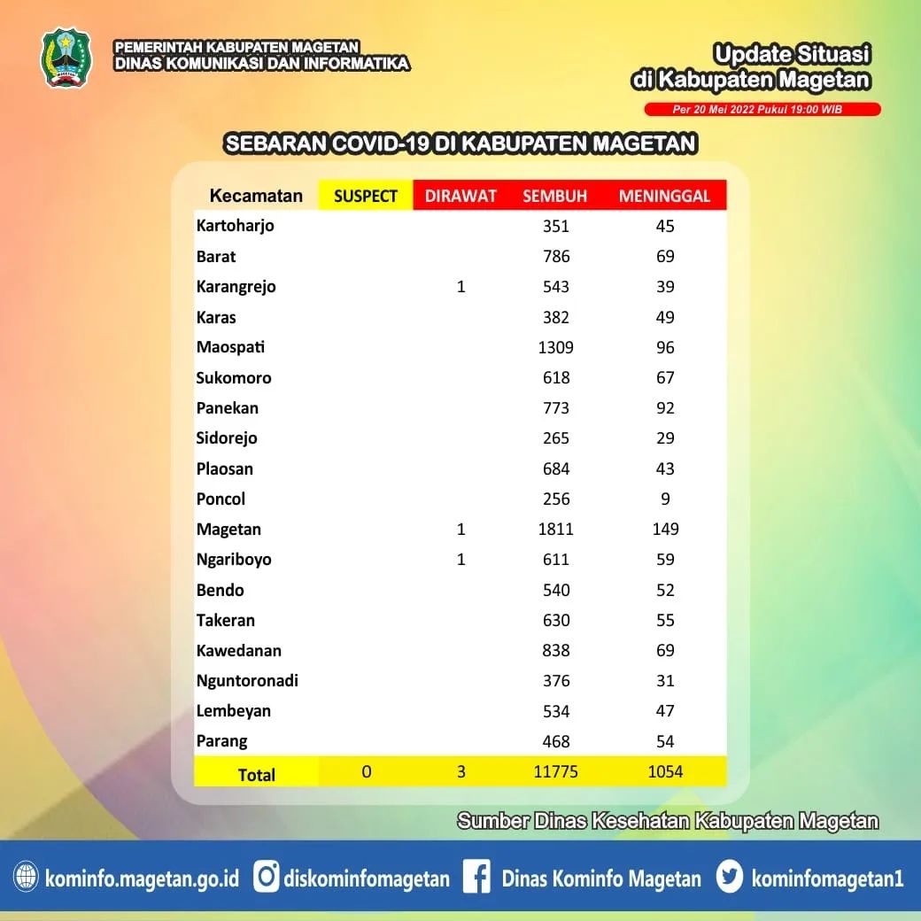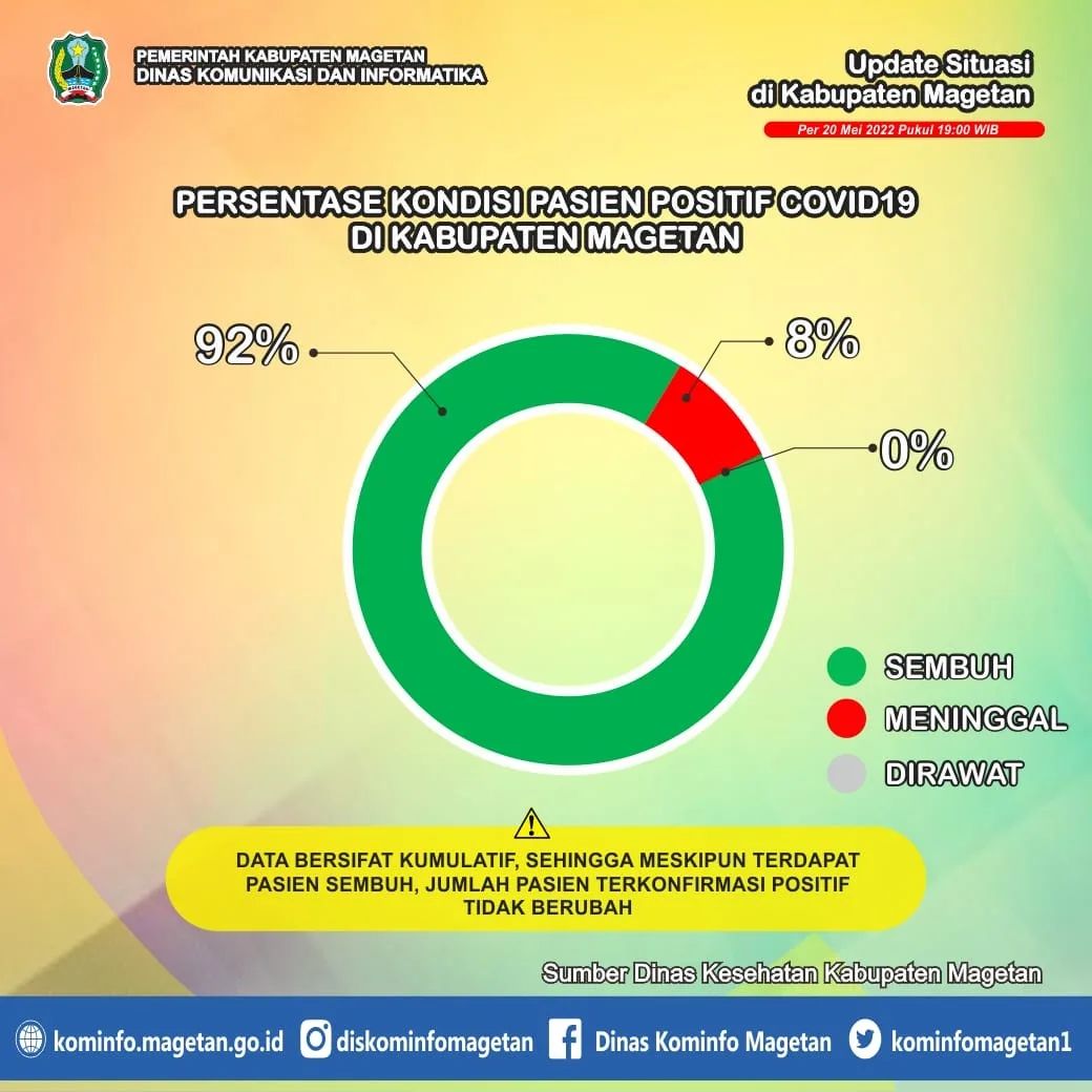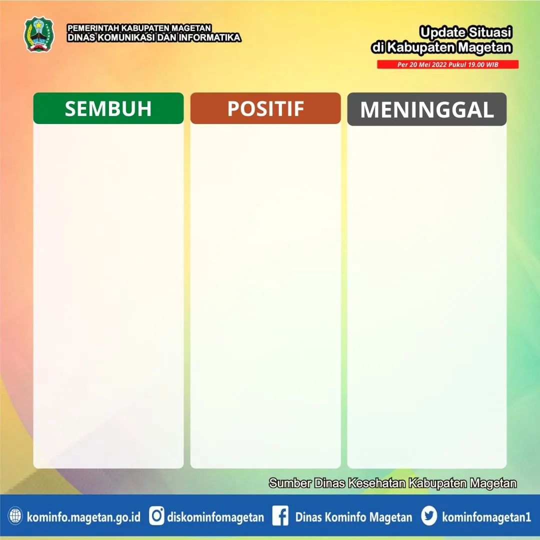 Berdasarkan data yang dihimpun dari Dinas Kesehatan Kabupaten Magetan, pasien sembuh COVID-19 pada Jumat (20/05) ada 0 orang. Sedangkan kasus terkonfirmasi COVID-19 pada hari ini ada 0 orang. Serta tidak ada warga yang dinyatakan meninggal dunia akibat COVID-19.