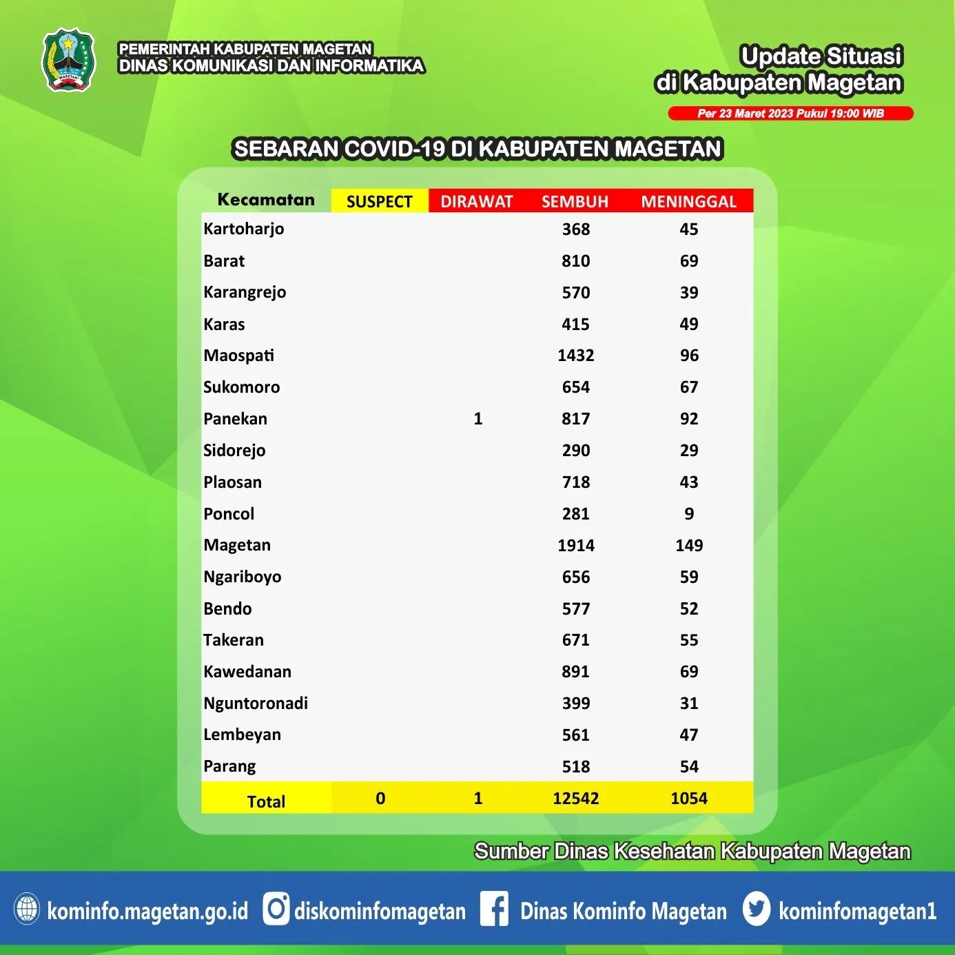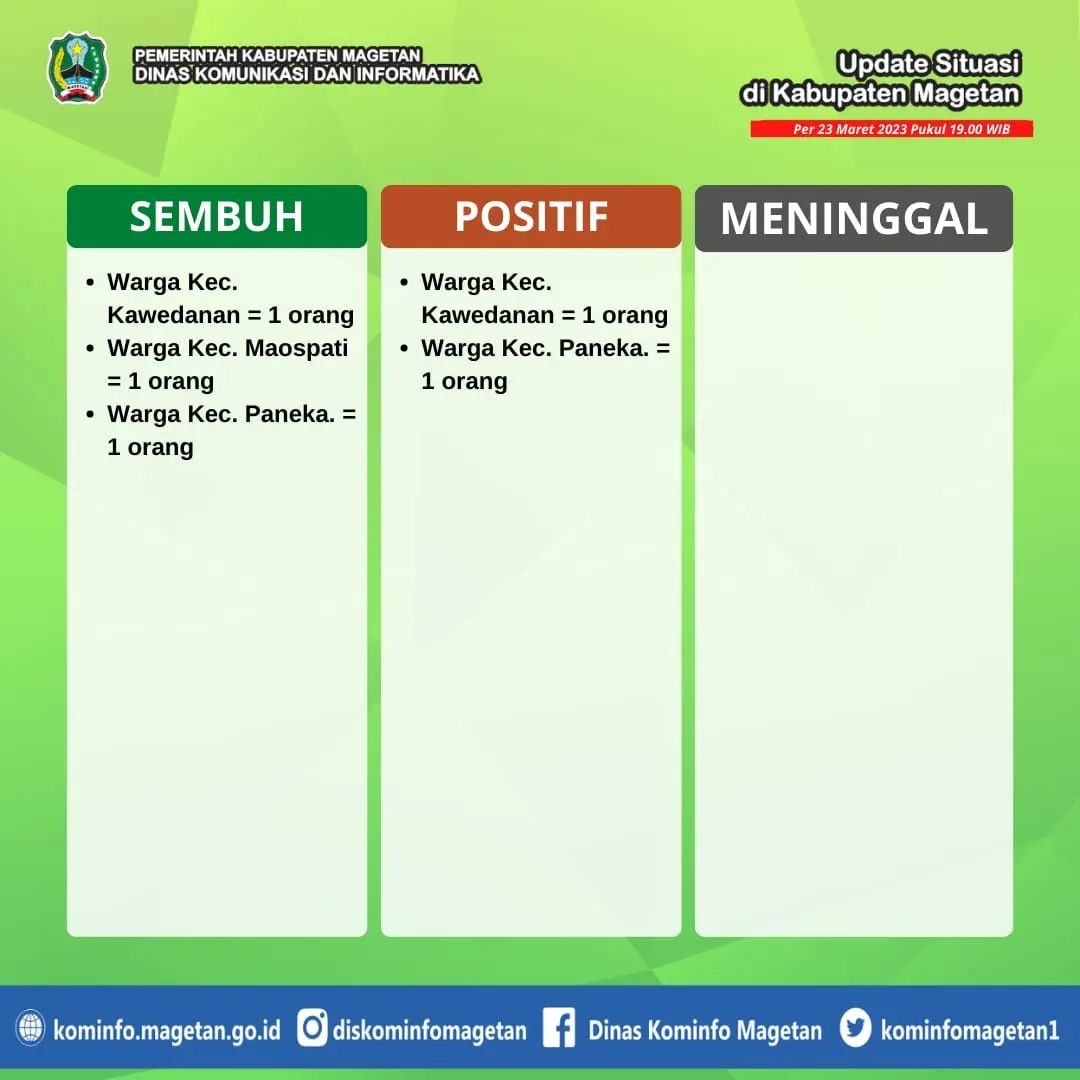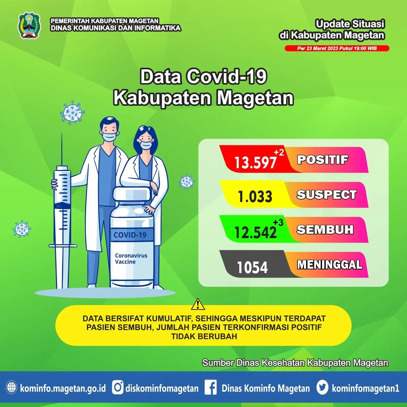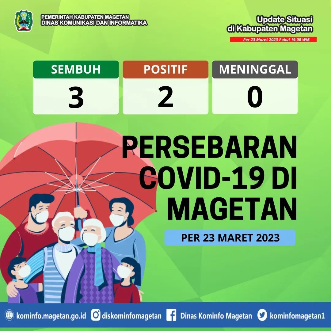 Berdasarkan data yang dihimpun dari Dinas Kesehatan Kabupaten Magetan, pasien sembuh COVID-19 pada Kamis (23/03) ada 3 orang. Sedangkan kasus terkonfirmasi COVID-19 pada hari ini ada 2 orang. Serta tidak ada penduduk yang dinyatakan meninggal dunia akibat COVID-19.