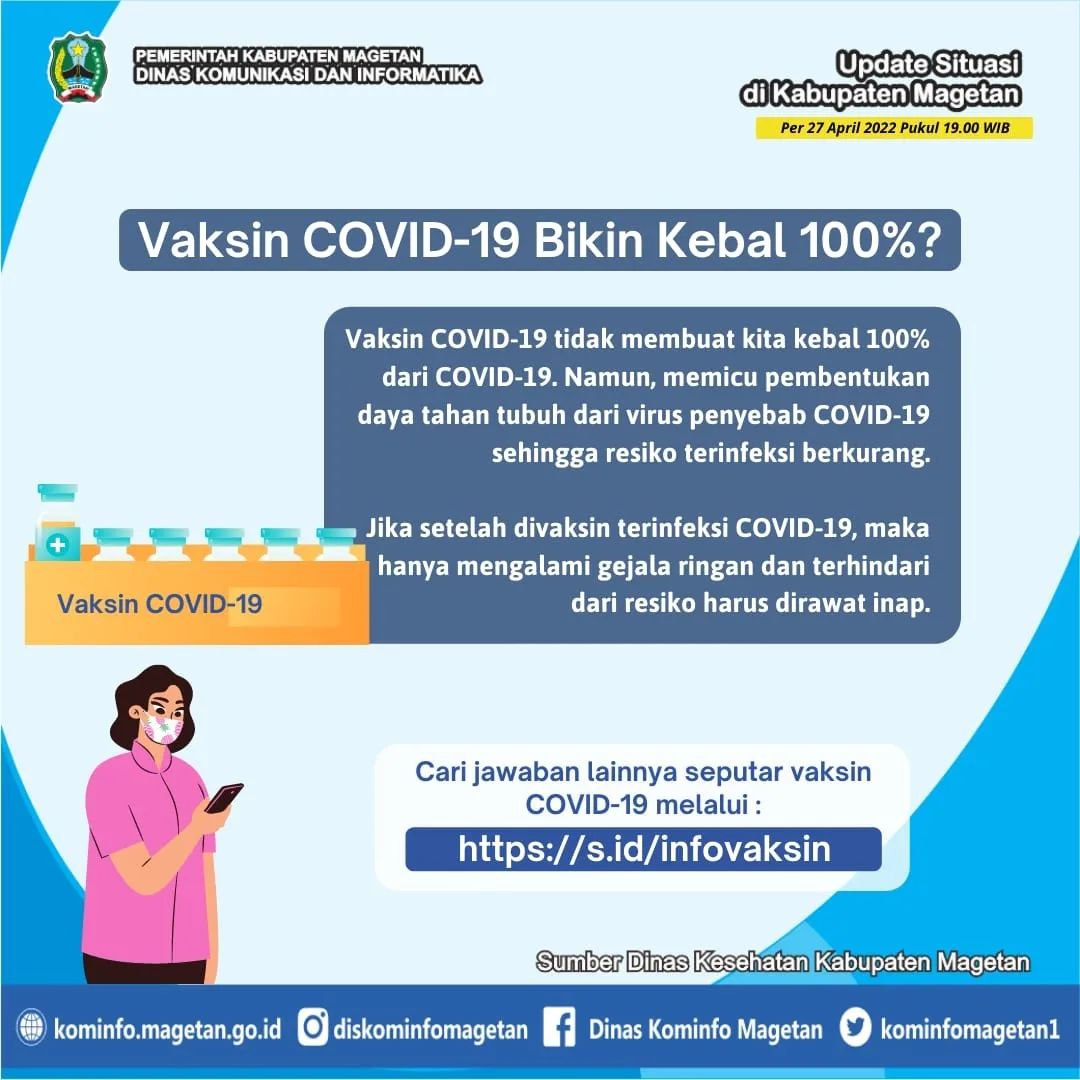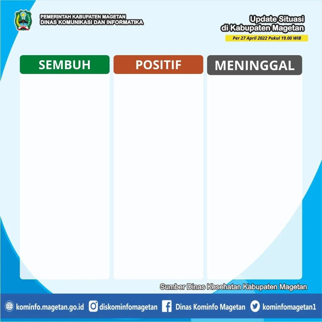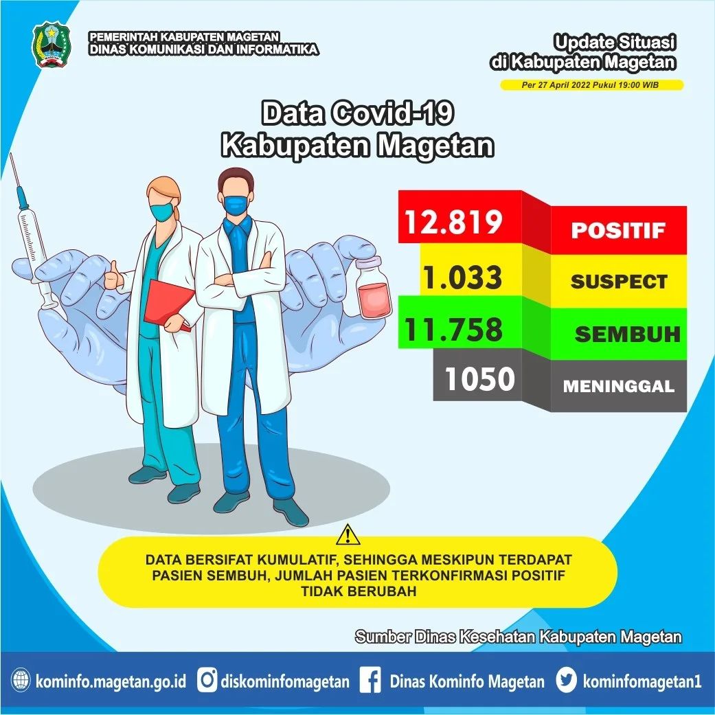 Berdasarkan data yang dihimpun dari Dinas Kesehatan Kabupaten Magetan, pasien sembuh COVID-19 pada Rabu (27/04) ada 0 orang. Sedangkan kasus terkonfirmasi COVID-19 pada hari ini ada 0 orang. Serta tidak ada warga yang dinyatakan meninggal dunia akibat COVID-19.
