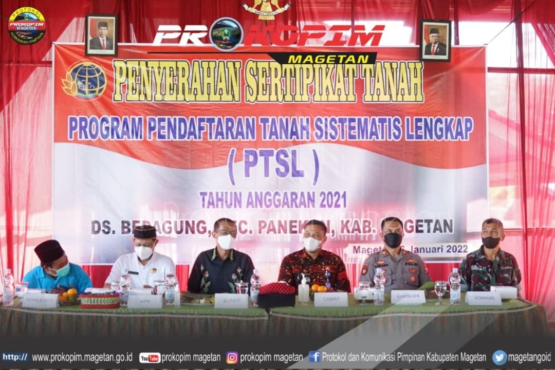 Sahabat Prokopim…Program Pendaftaran Tanah Sertipikat Lengkap (PTSL) kembali bergulir. Hari ini Kamis (6/01/2022) warga Desa Bedagung, Kecamatan Panekan bisa tersenyum lega. Pasalnya setelah sekian lama menunggu, akhirnya mereka bisa menerima sertipikat tanah melalui program PTSL tersebut.